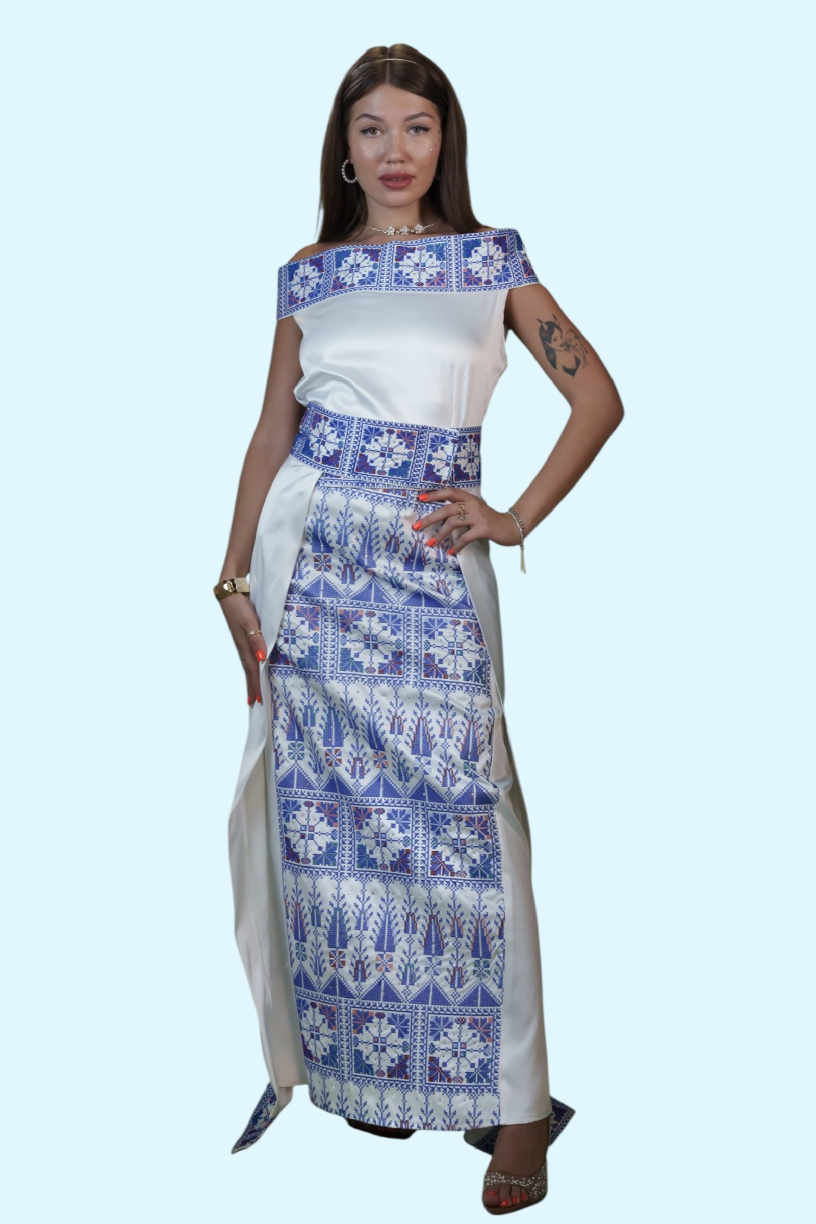 فستان عصري مكشوف الكتفين بتصميم شعبي، مصنوع من قماش جيسيكا الفاخر المطرز بأحدث تقنيات التطريز. يمزج ببراعة بين سحر التراث والموضة العصرية لإطلالة أنيقة وعصرية.