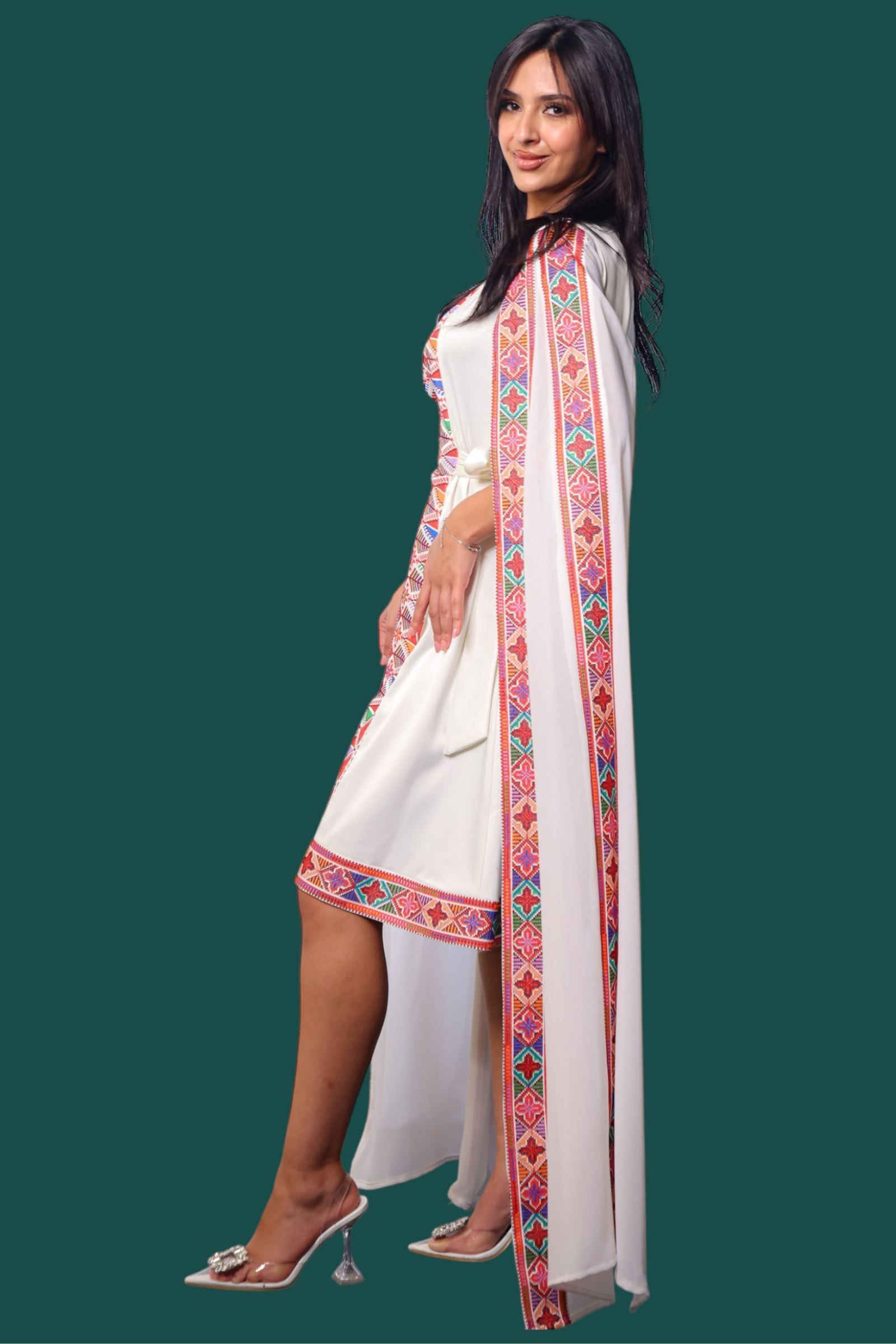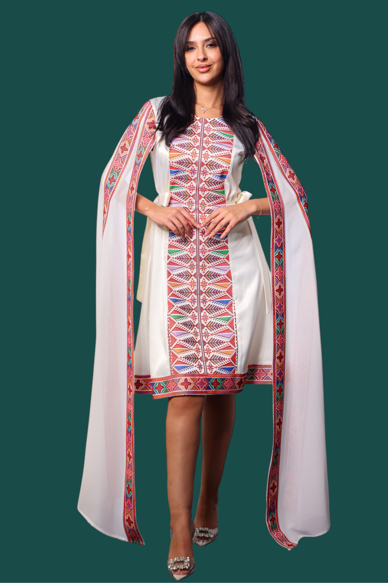 - لمسة معاصرة على الزي الريفي التقليدي، تتميز بتطريز حريري فرنسي رقيق - يمزج بين التراث الثقافي والأناقة الحديثة.