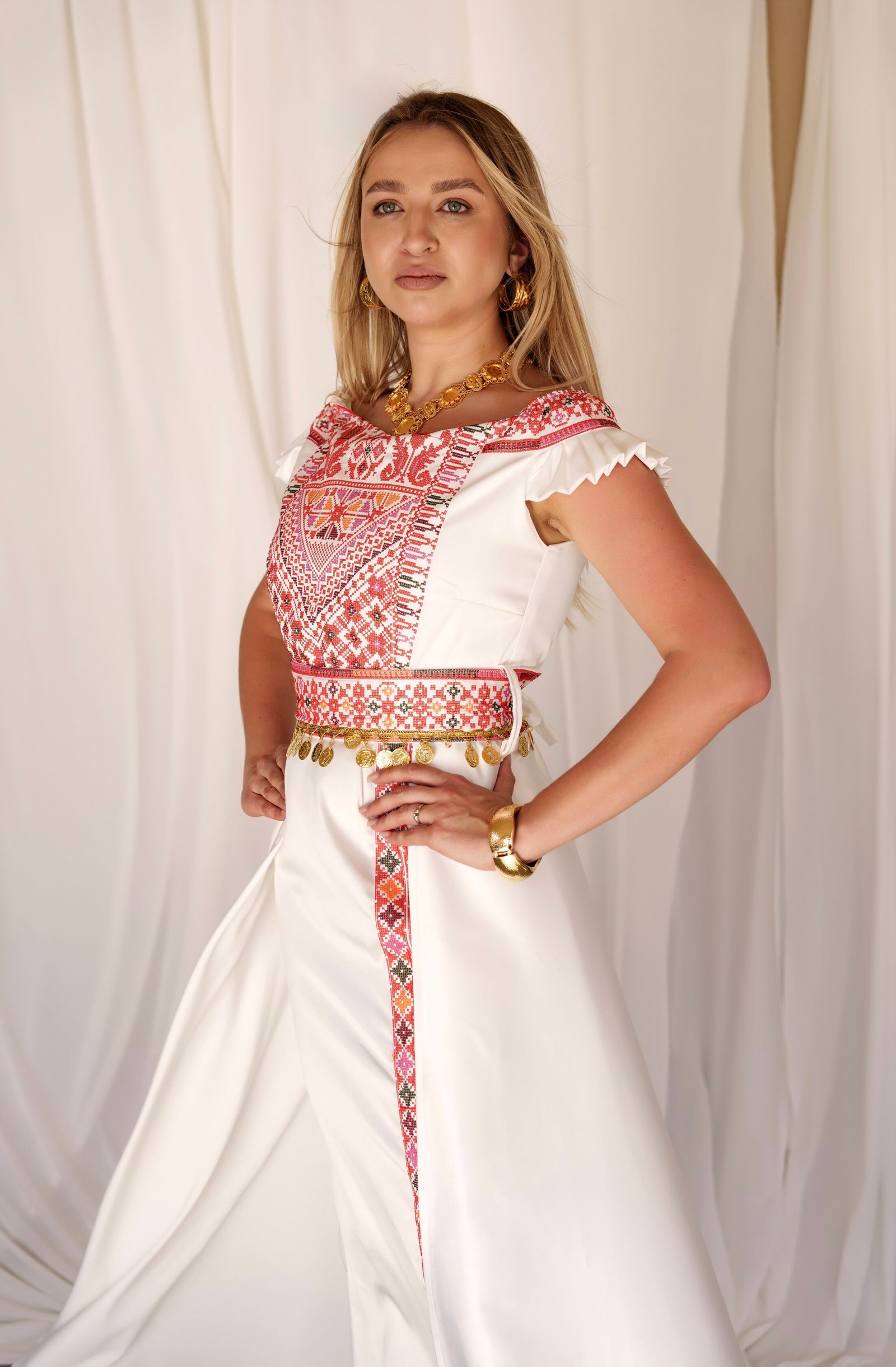 - فستان عصري على طراز فلاحي مصنوع من قماش روزمير الفاخر، يتميز بتطريز كلاسيكي يعكس الحرفية الثقافية الأصيلة مع لمسة معاصرة.