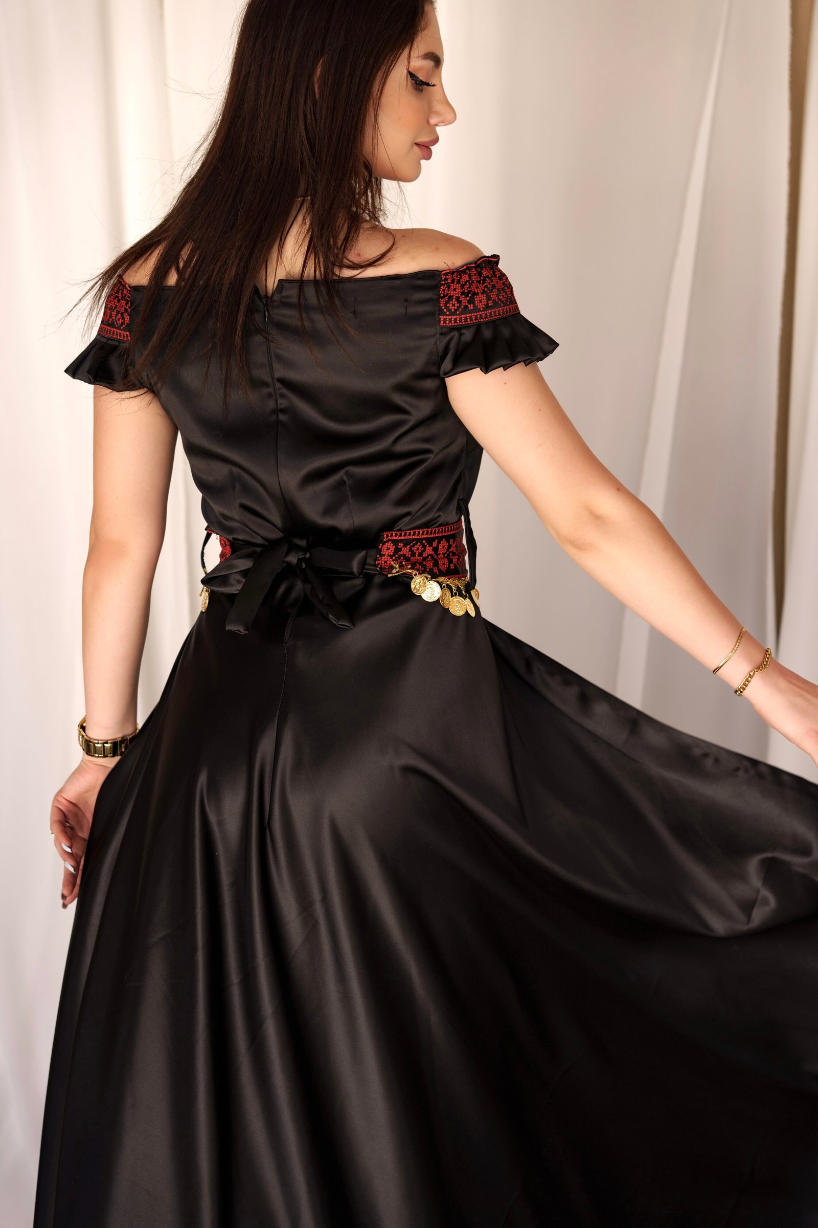 - فستان عصري على طراز فلاحي مصنوع من قماش روزمير الفاخر، يتميز بتطريز كلاسيكي يعكس الحرفية الثقافية الأصيلة مع لمسة معاصرة.