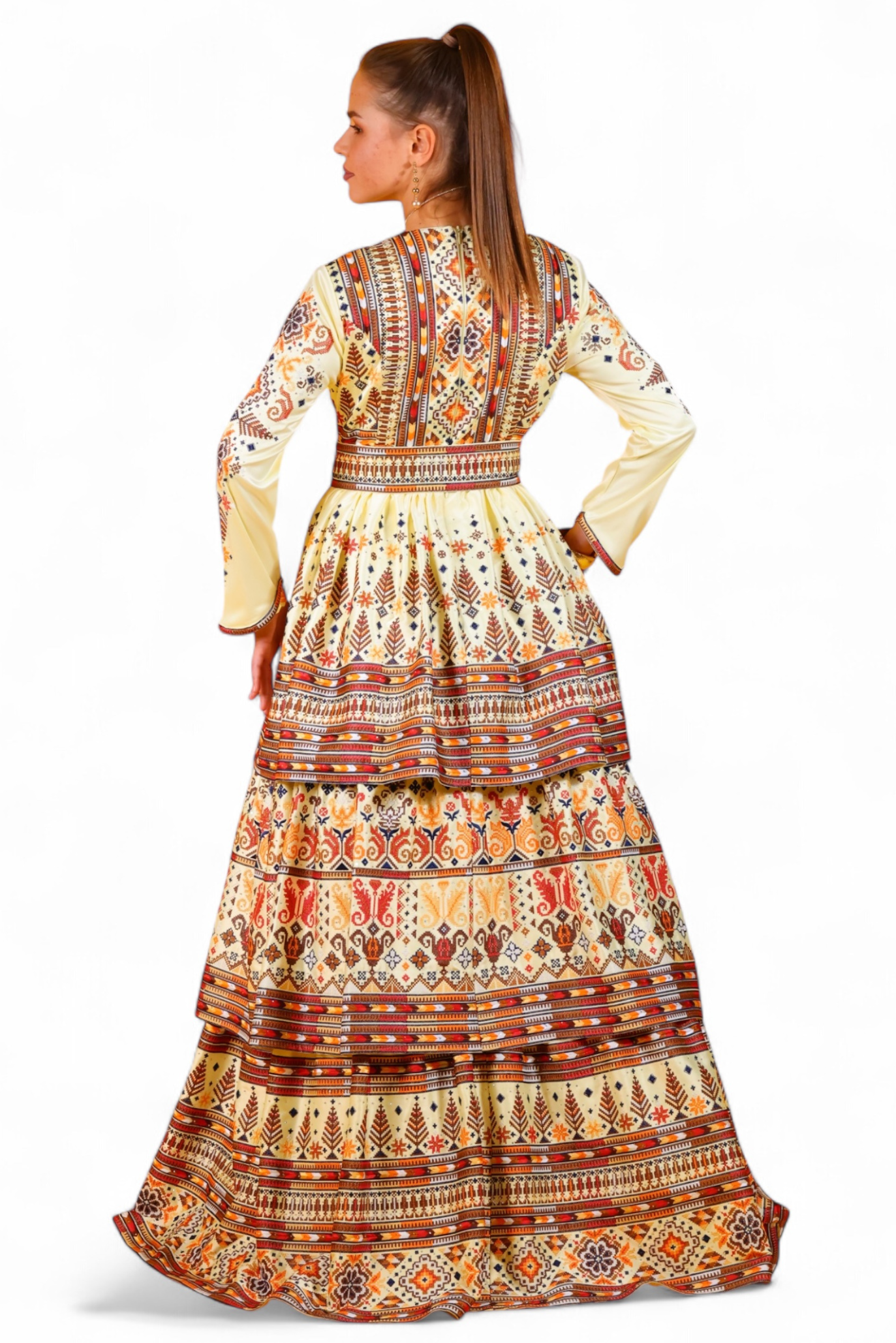 فستان فلاحي مودرن طبقات مطرزة يدوياً بخيط الحرير وقماش الجيسكا