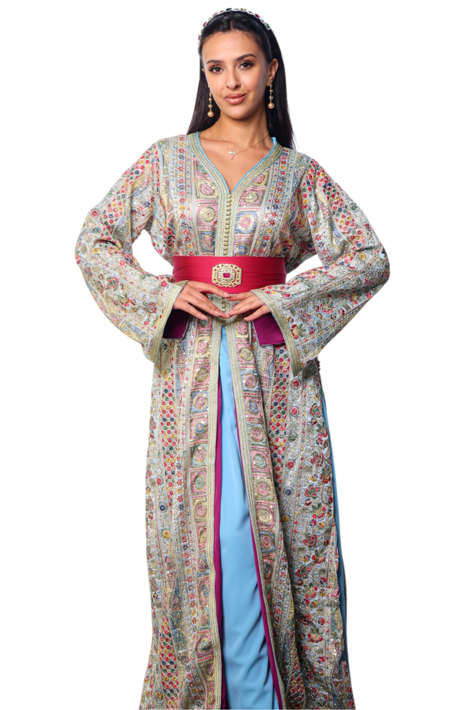 - قفطان مغربي أنيق مكون من قطعتين مصنوع من الحرير وقماش روزمير، يتميز بتطريز يدوي رائع بالخرز (تشاك).مزيج مثالي بين الفخامة والتقاليد.