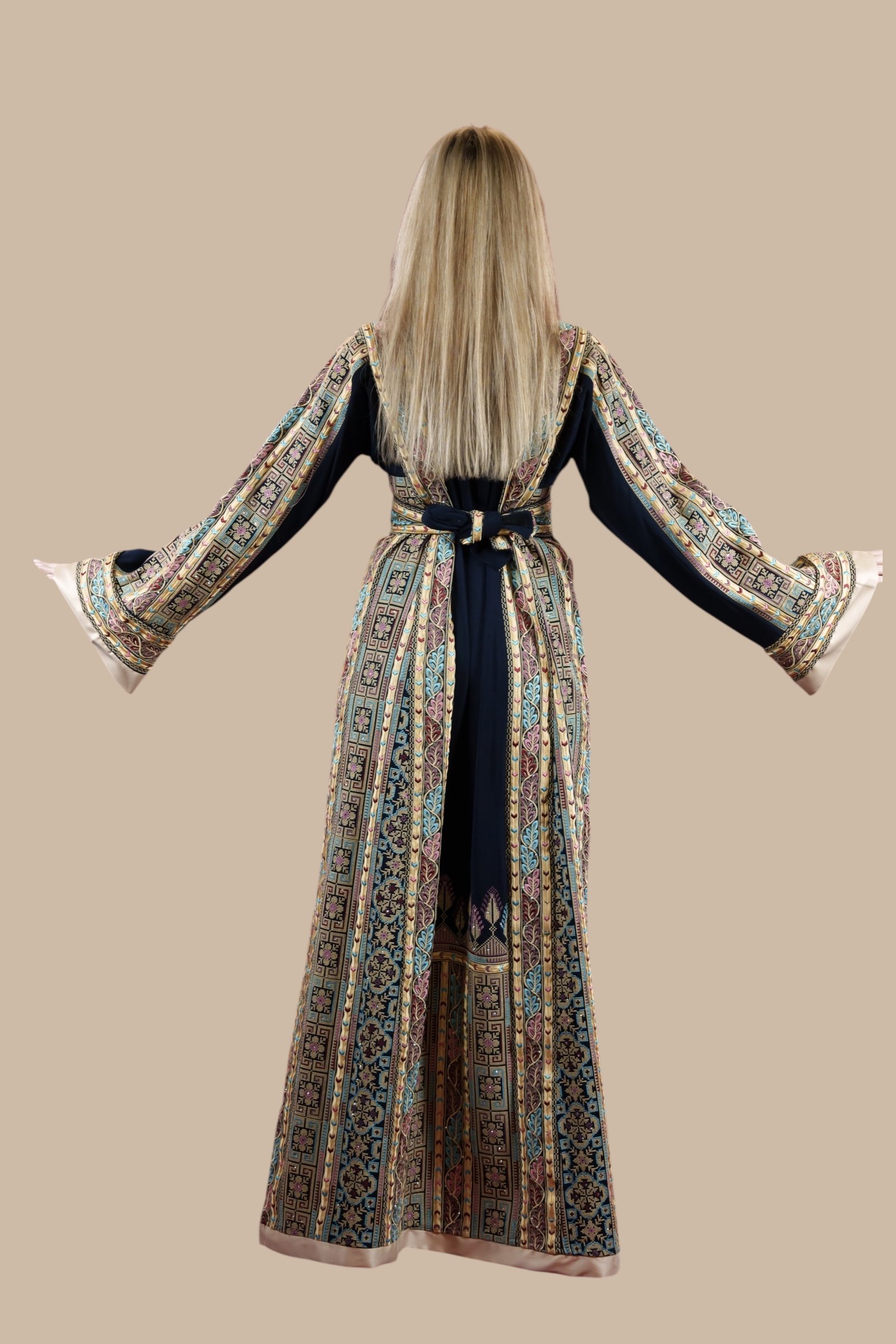 - فستان شعبي أنيق من نصف تول، يتميز بتطريز فلسطيني تقليدي على طريقة الثماني غرز، مصنوع بخيوط DMC عالية الجودة. تعكس هذه القطعة التراث الأصيل والحرفية الرفيعة، مثالية للمناسبات الثقافية والخاصة.