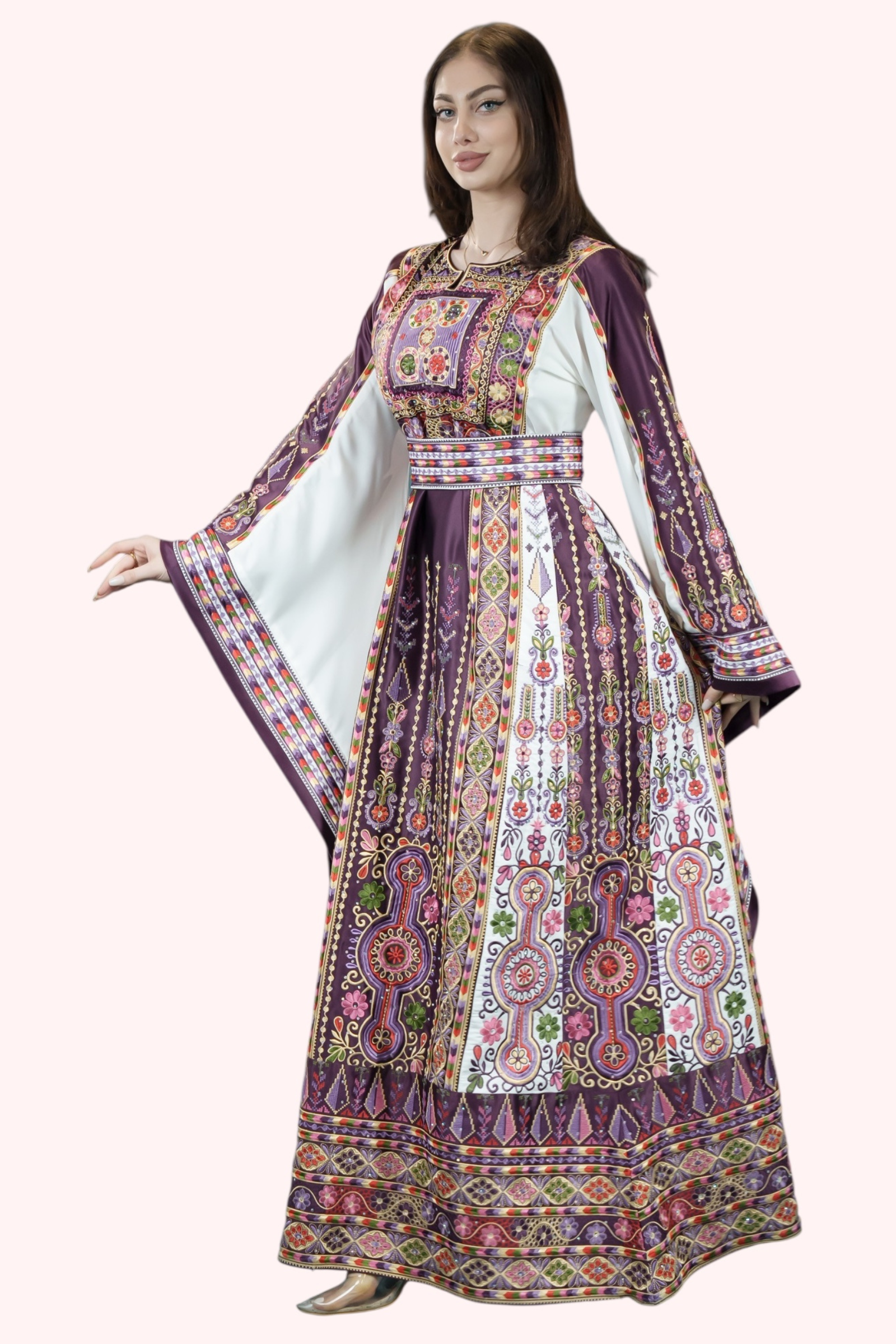 - فستان ملكي عصري رائع، يتميز بتطريز شعبي فلسطيني متقن، مصنوع من قماش جيسيكا الفاخر. تمزج هذه القطعة الأنيقة بين التراث الثقافي والموضة المعاصرة، مثالية للمناسبات الخاصة والاحتفالات.