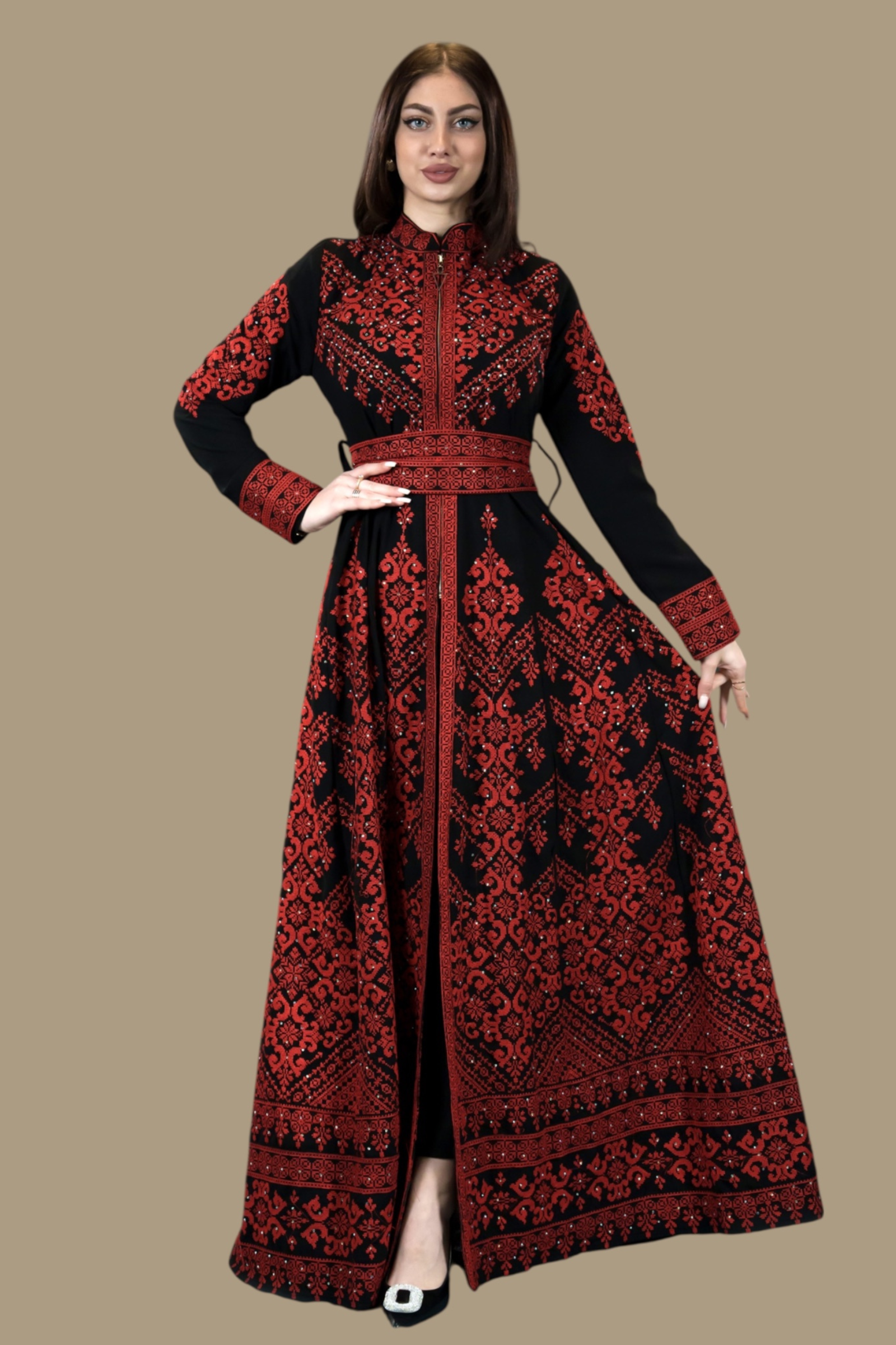 - قفطان مذهل من قطعتين مصنوع من قماش الكريب الفاخر، يتميز بتطريز كامل بتقنيات يدوية دقيقة. يجمع هذا الطقم الأنيق بين الفن التقليدي والحرفية الحديثة، وهو مثالي للمناسبات الخاصة.
