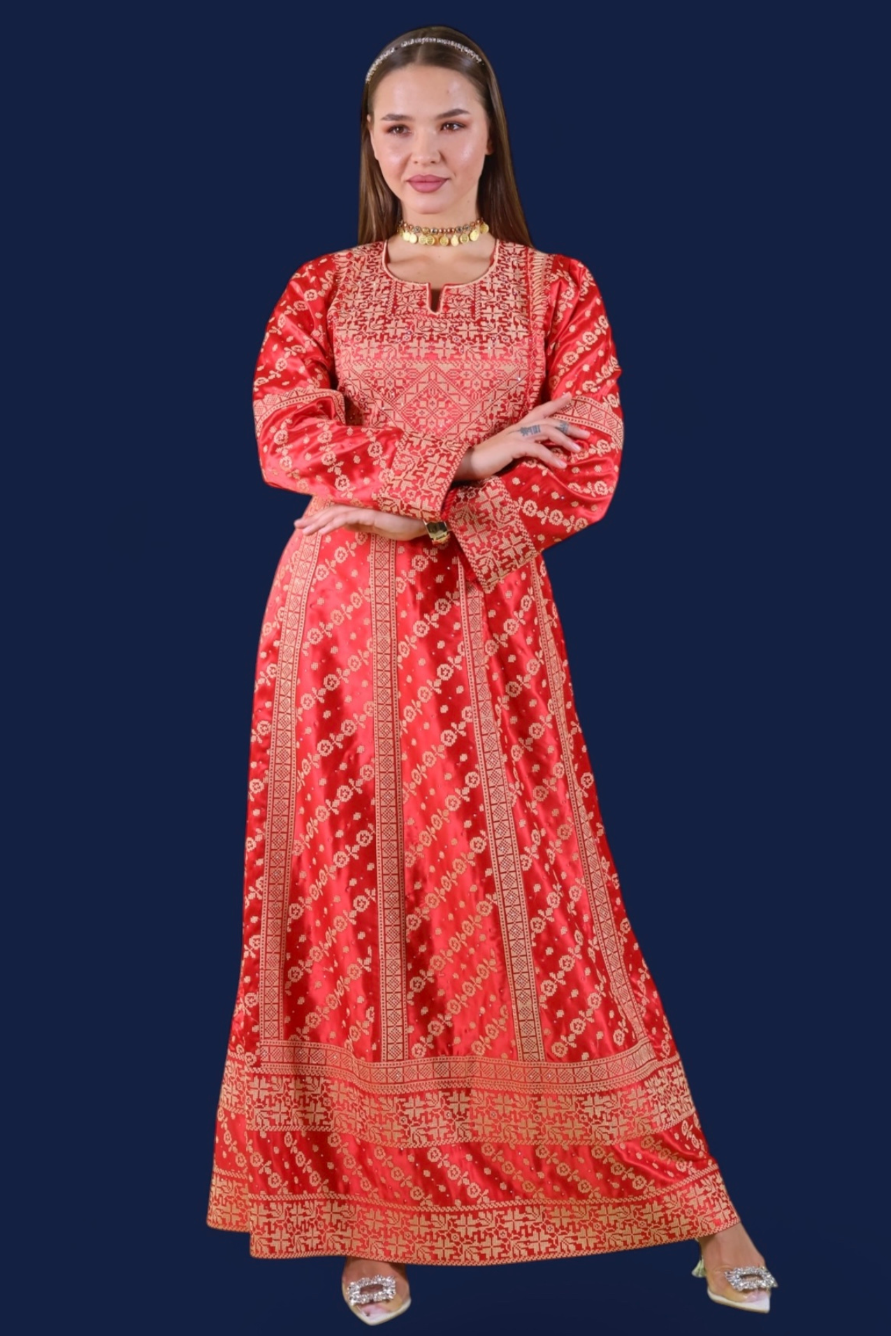 - ثوبٌ فخمٌ مصنوعٌ من مخمل الحرير والمبراد الكوري، مُطرّزٌ يدوياً بتطريزٍ يدويٍّ بديع. يمزج هذا التصميم بين الأناقة الملكية والحرفية التقليدية.