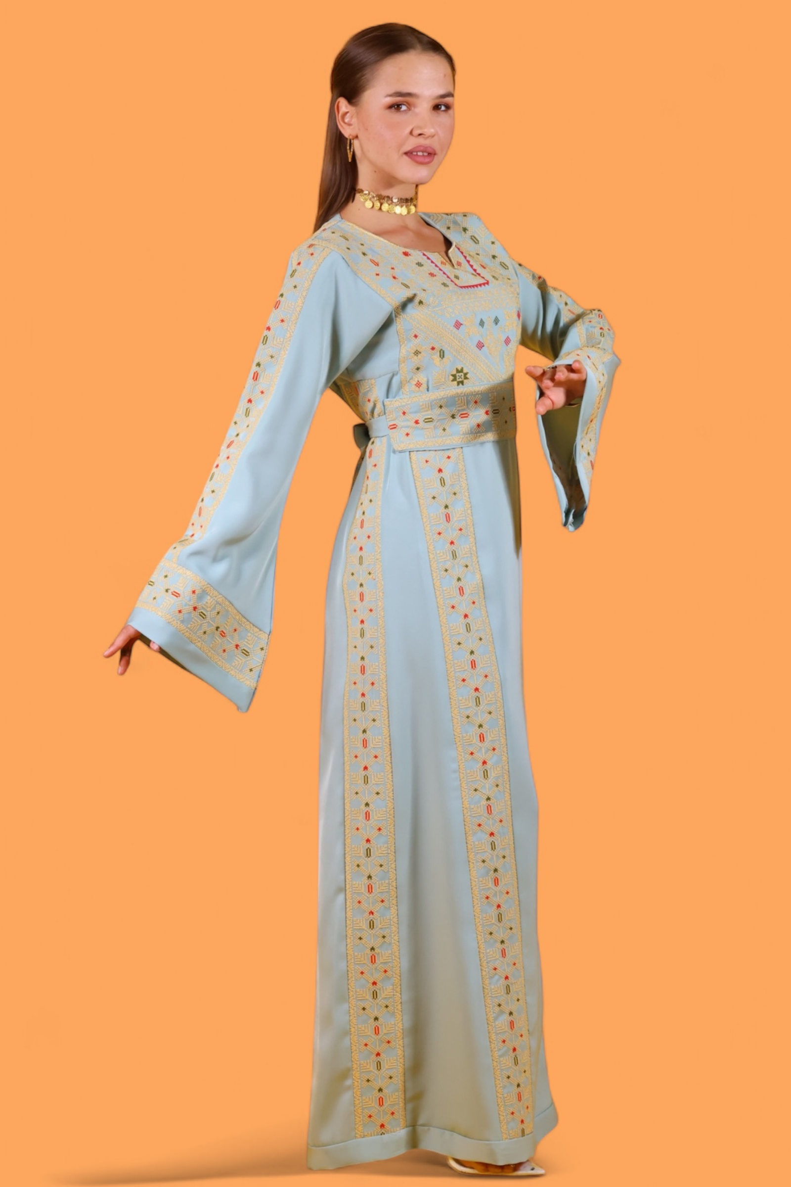 ثوب عصري مصمم بلمسة أصلية فلاحي تطريز على قماش كريب باربي الناعم. مزيج رائع من سحر الثقافة وأسلوب عصري.