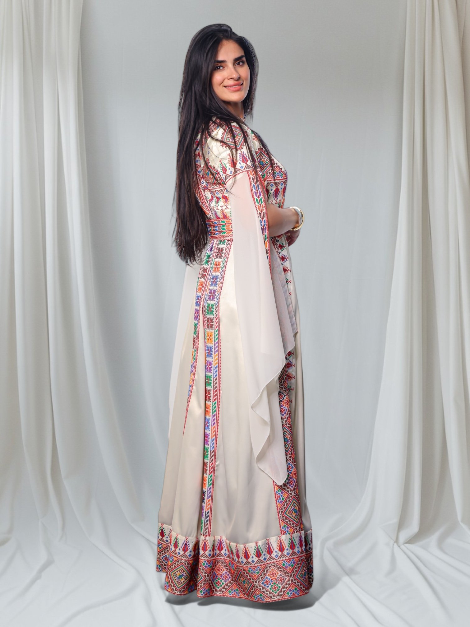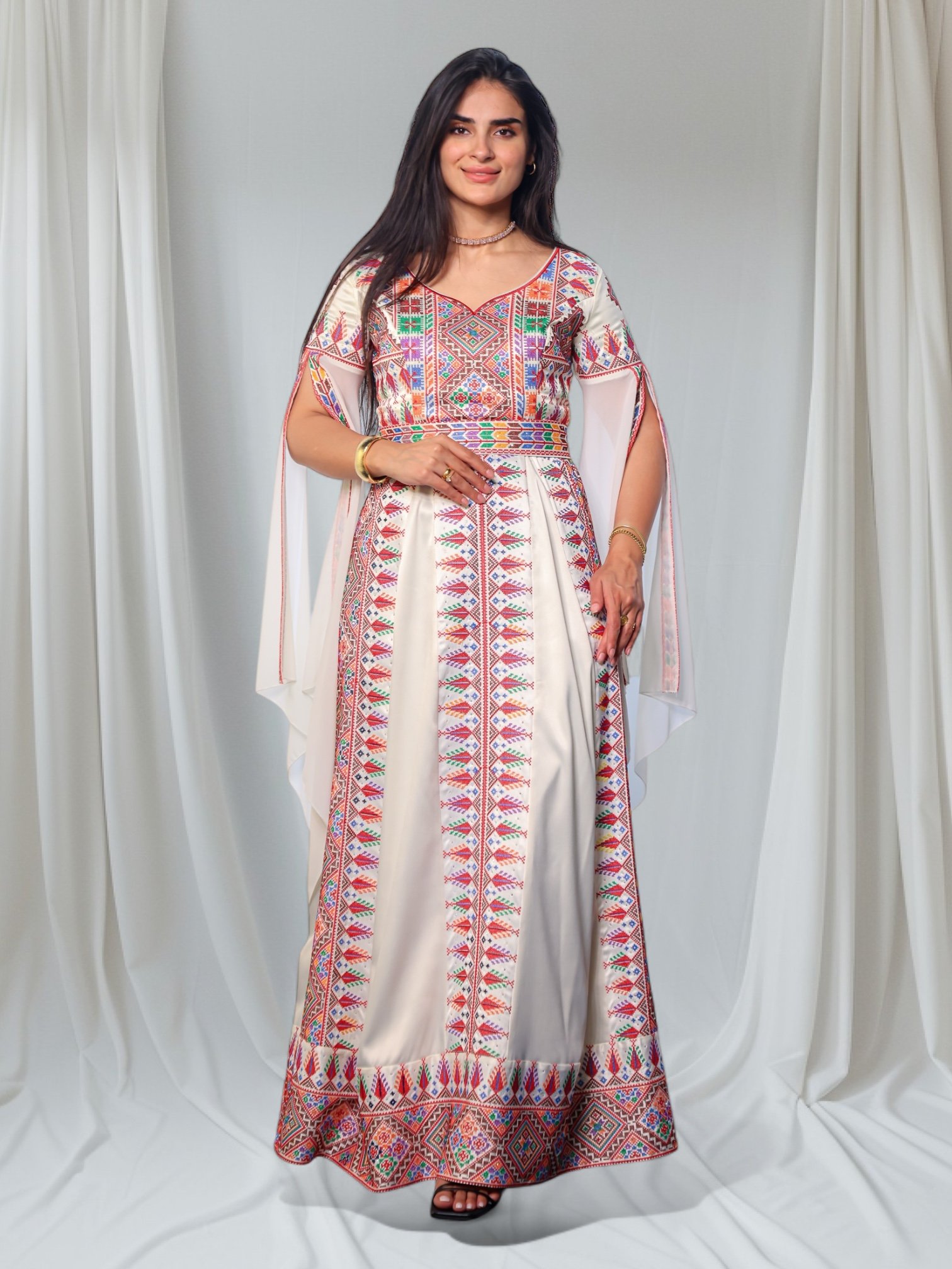 - قفطان عصري مصنوع من قماش روزمير الأنيق، مزين بتطريز فلاحي تقليدي بجمال أخاذ. حيث تلتقي براعة الفن الكلاسيكي مع الأسلوب المعاصر.