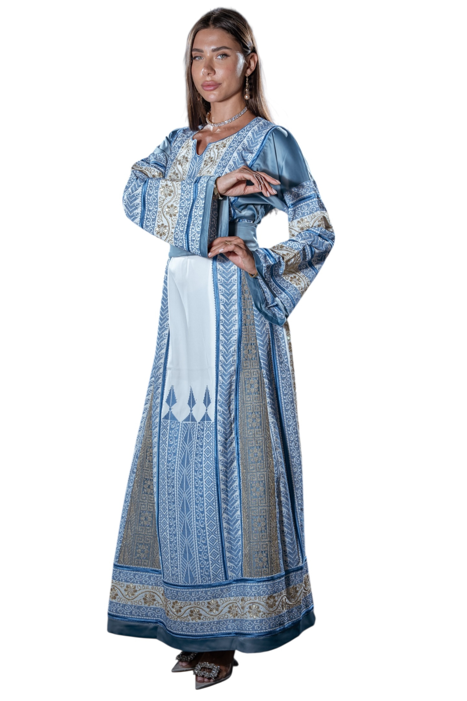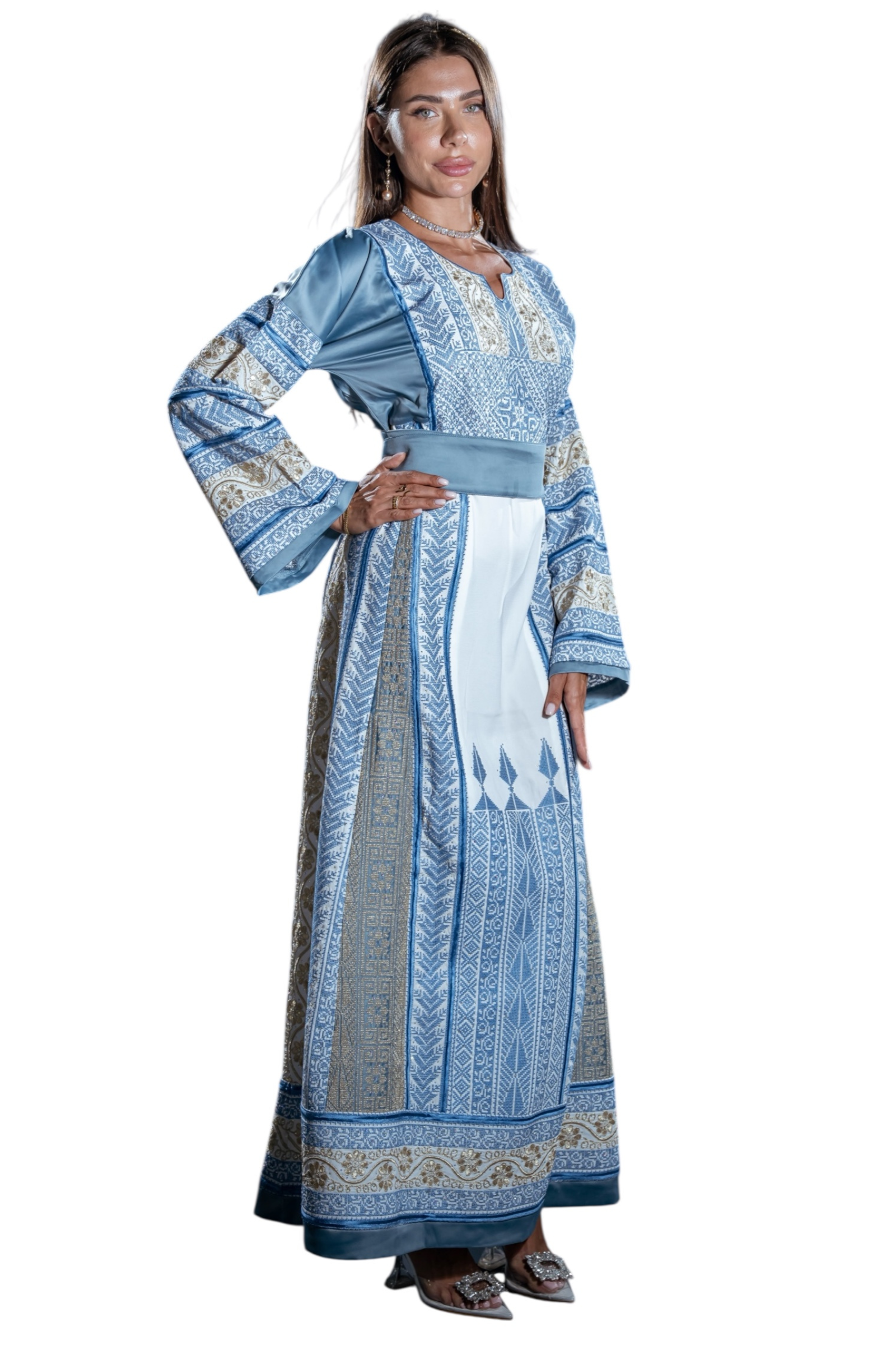 - فستان رقيق من التول نصفي مطرز بإتقان بخيوط الحرير وقصب السكر الإسباني، مصنوع من قماش ناعم بلون الحبر. مثالي للمناسبات الأنيقة، يجمع بين الخامات الفاخرة والتفاصيل الدقيقة.