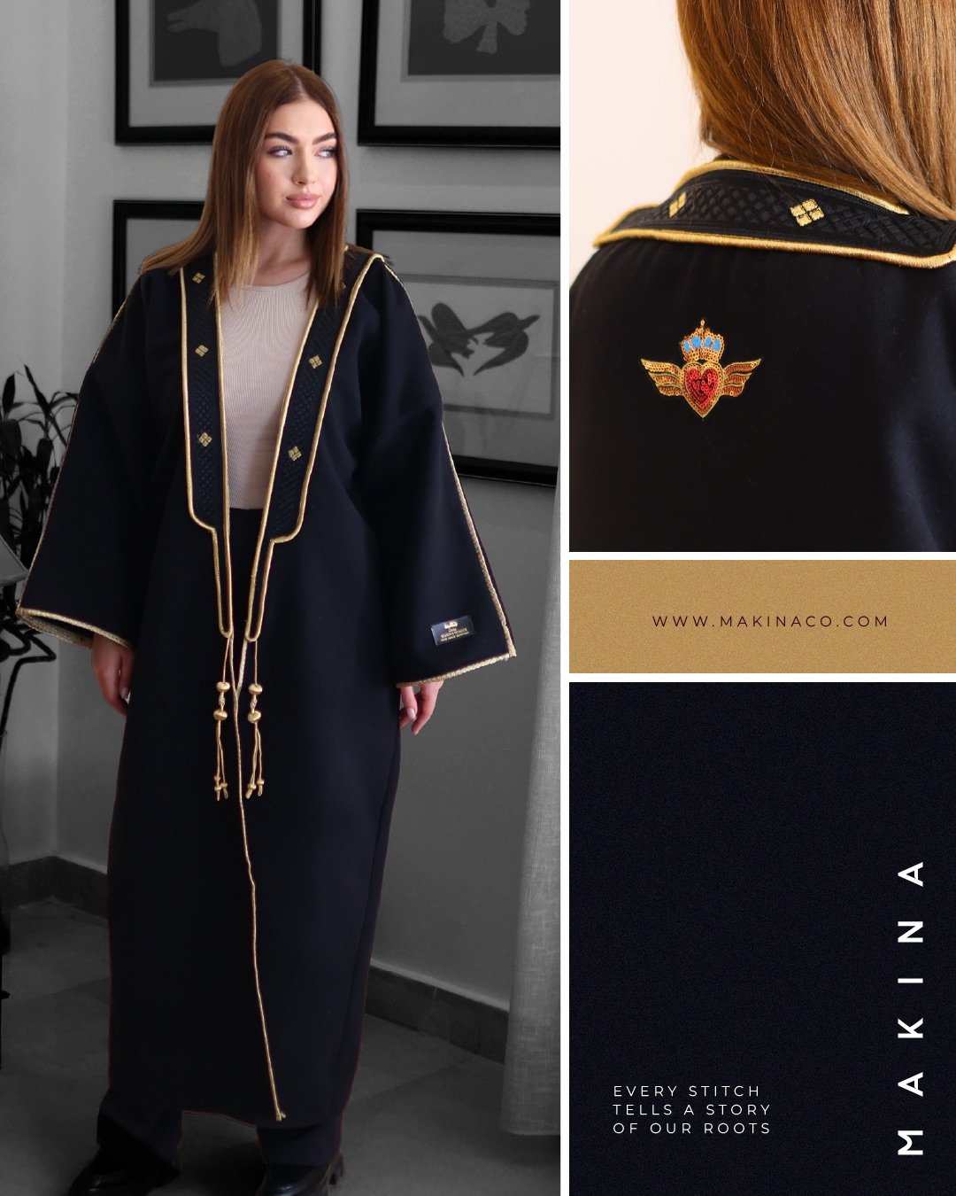 بشت عربي مصنوع من صوف ثقيل مميز، ومزين بتفاصيل قصاب ذهبية راقية.