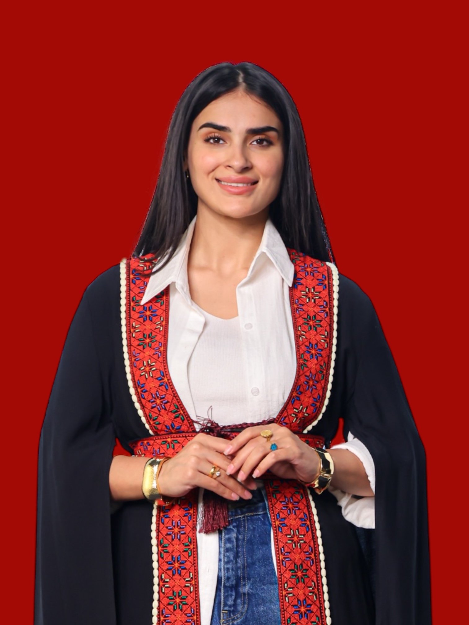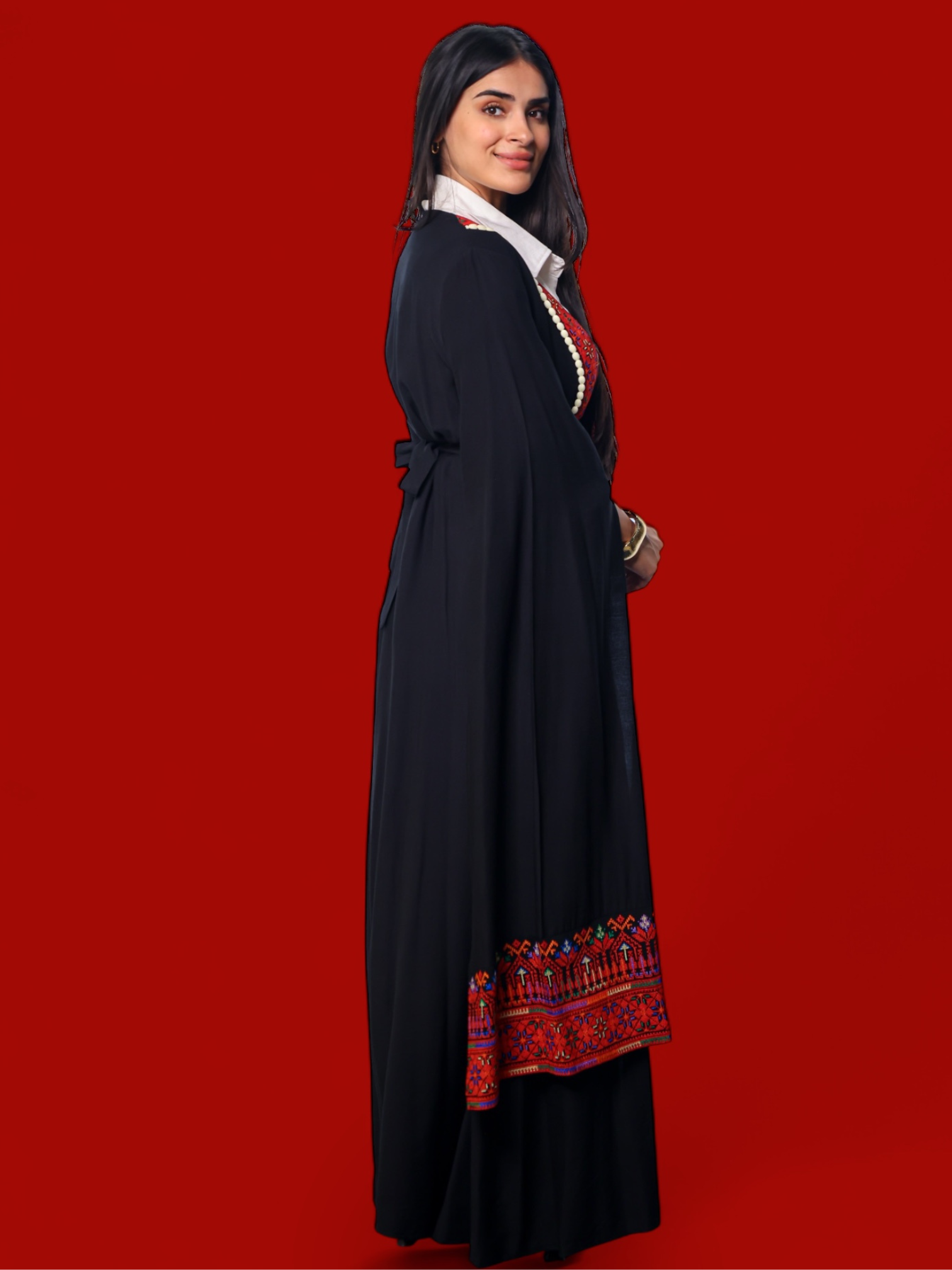 • Modern bisht with traditional Fellahi embroidery.