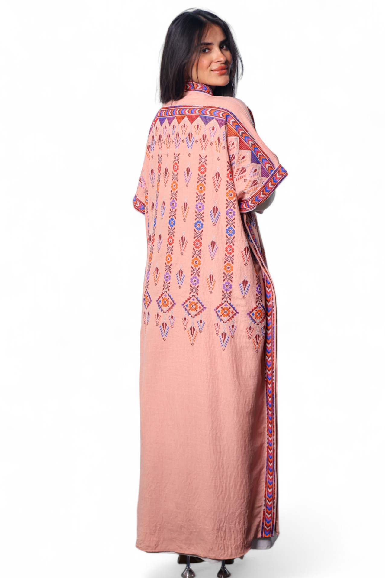 - A refined linen bisht, hand-embroidered using the traditional hoop technique with fine French silk thread—combining artisanal precision with timeless elegance.