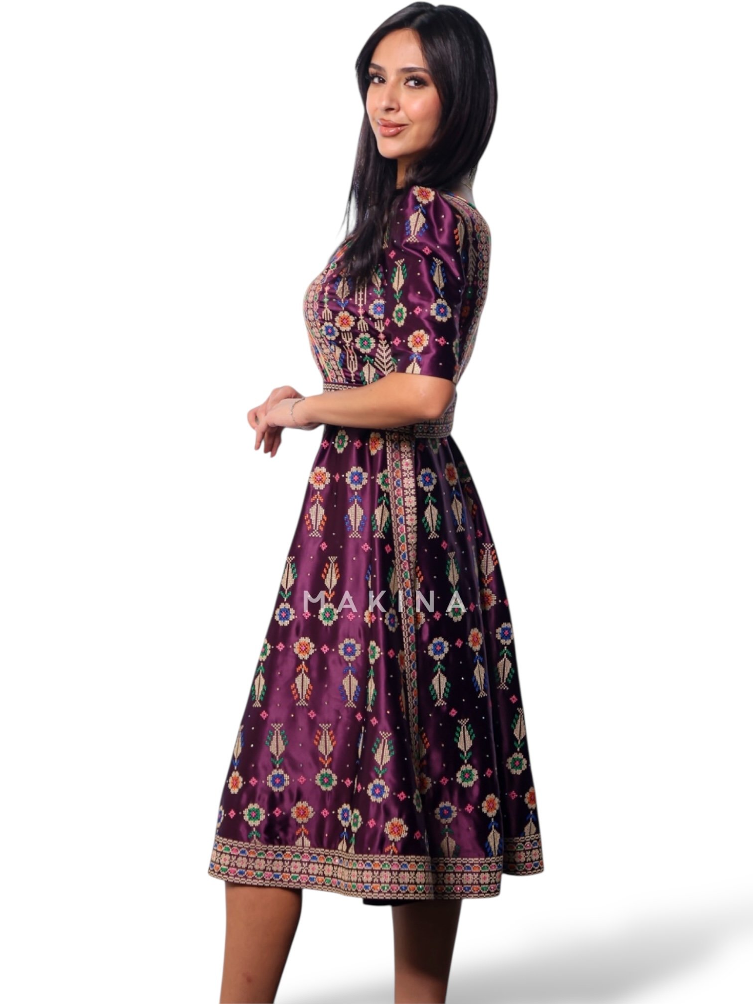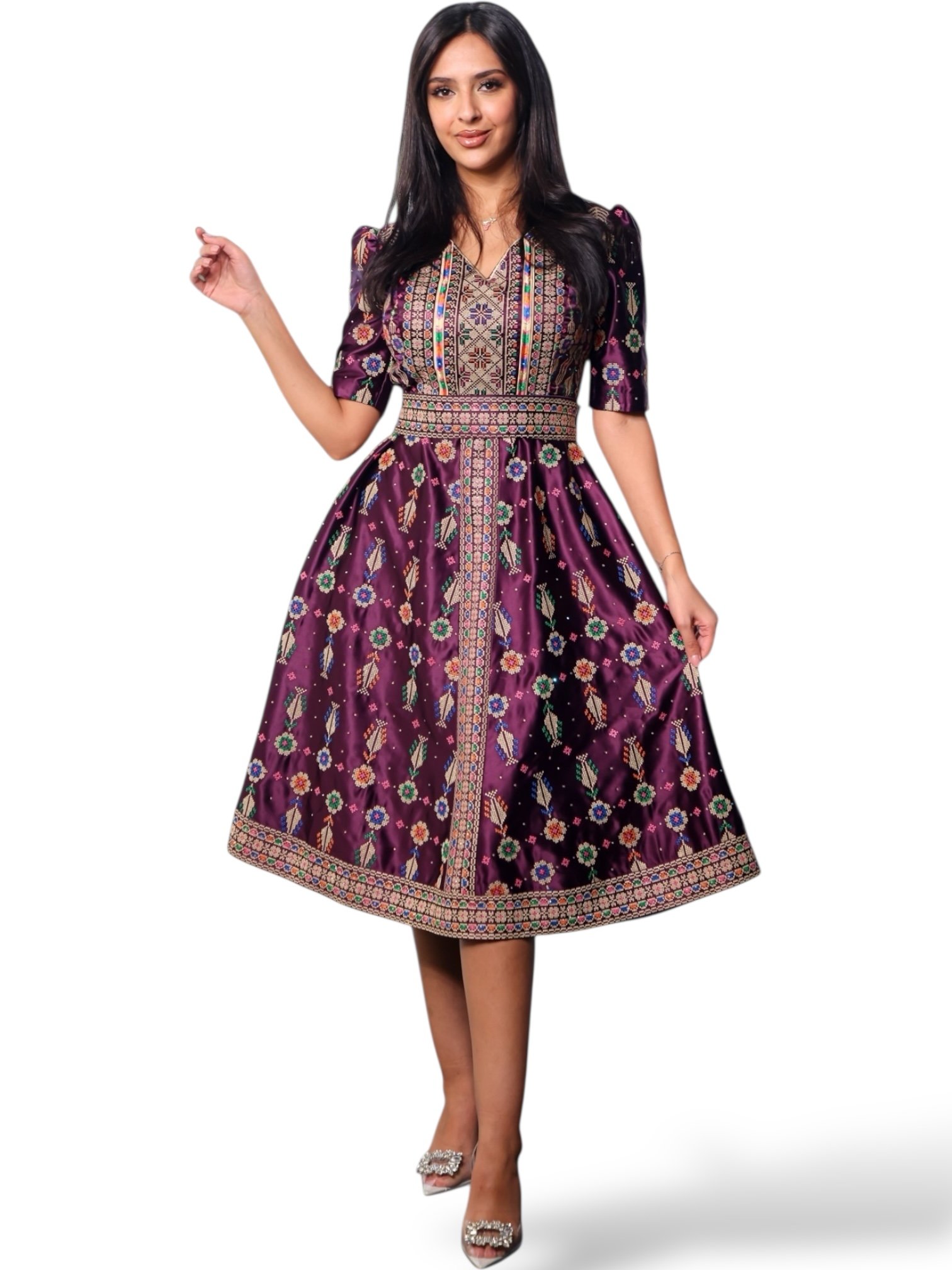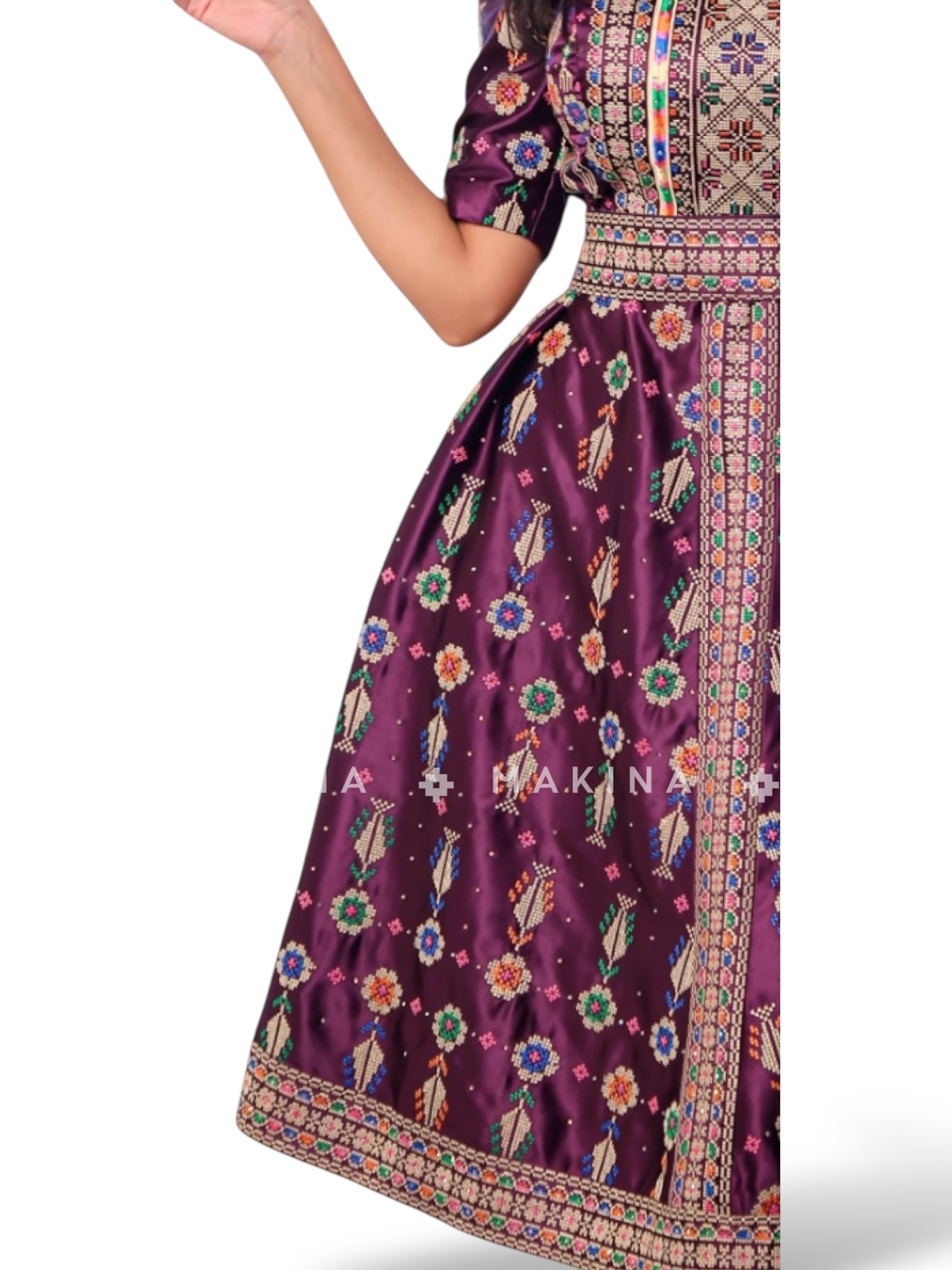 • A luxurious full-length velvet dress adorned with delicate damask rose motifs and scattered sparkling Swarovski crystals, creating a stunning and graceful look.