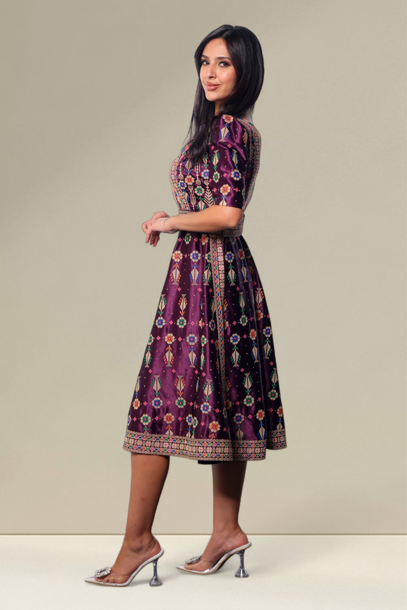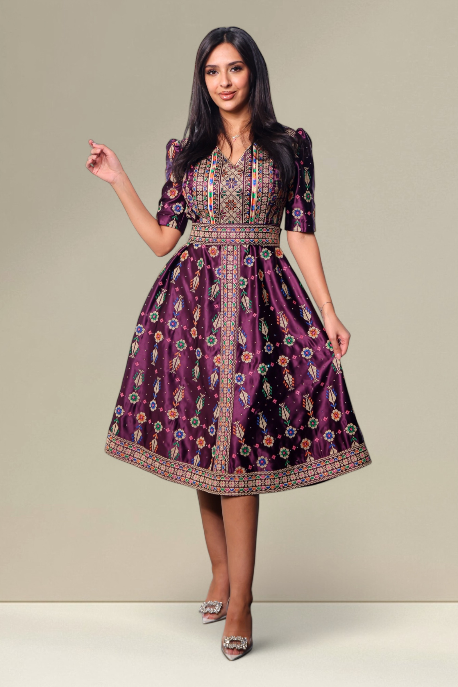 - A luxurious full-length velvet dress adorned with delicate damask rose motifs and scattered sparkling Swarovski crystals, creating a stunning and graceful look.