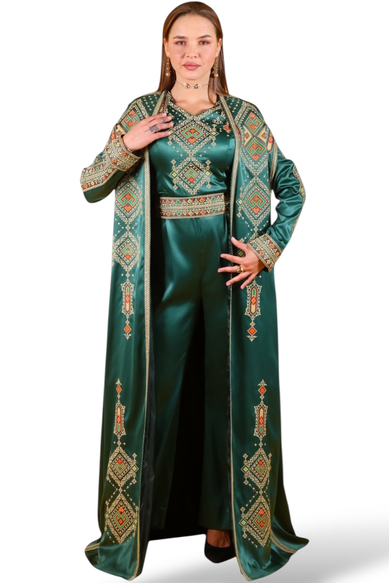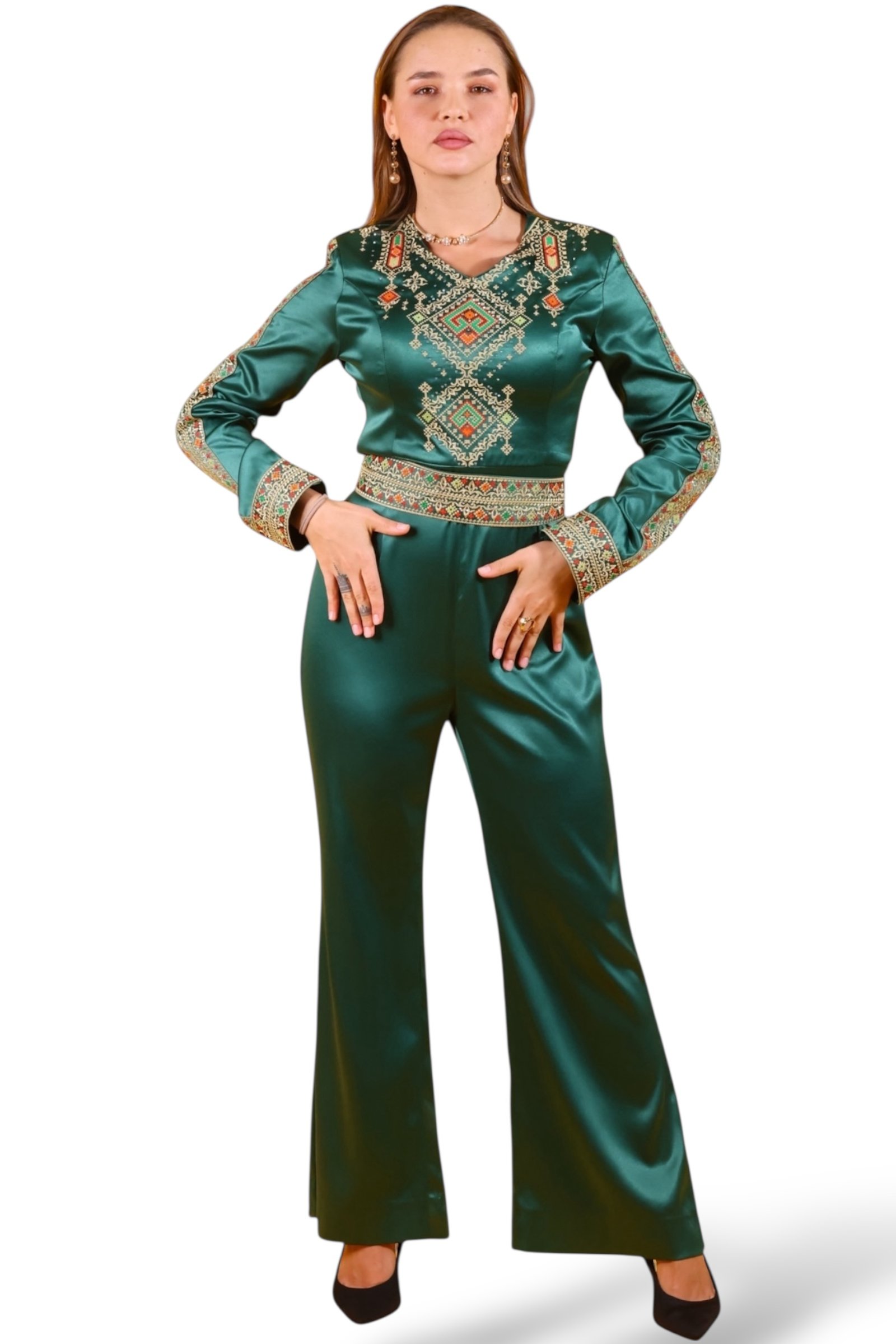 - Elegant jumpsuit with a matching cape, crafted from embroidered Jeska fabric using a hand-operated Tara machine and detailed with double-stitch work. A bold and refined statement piece.