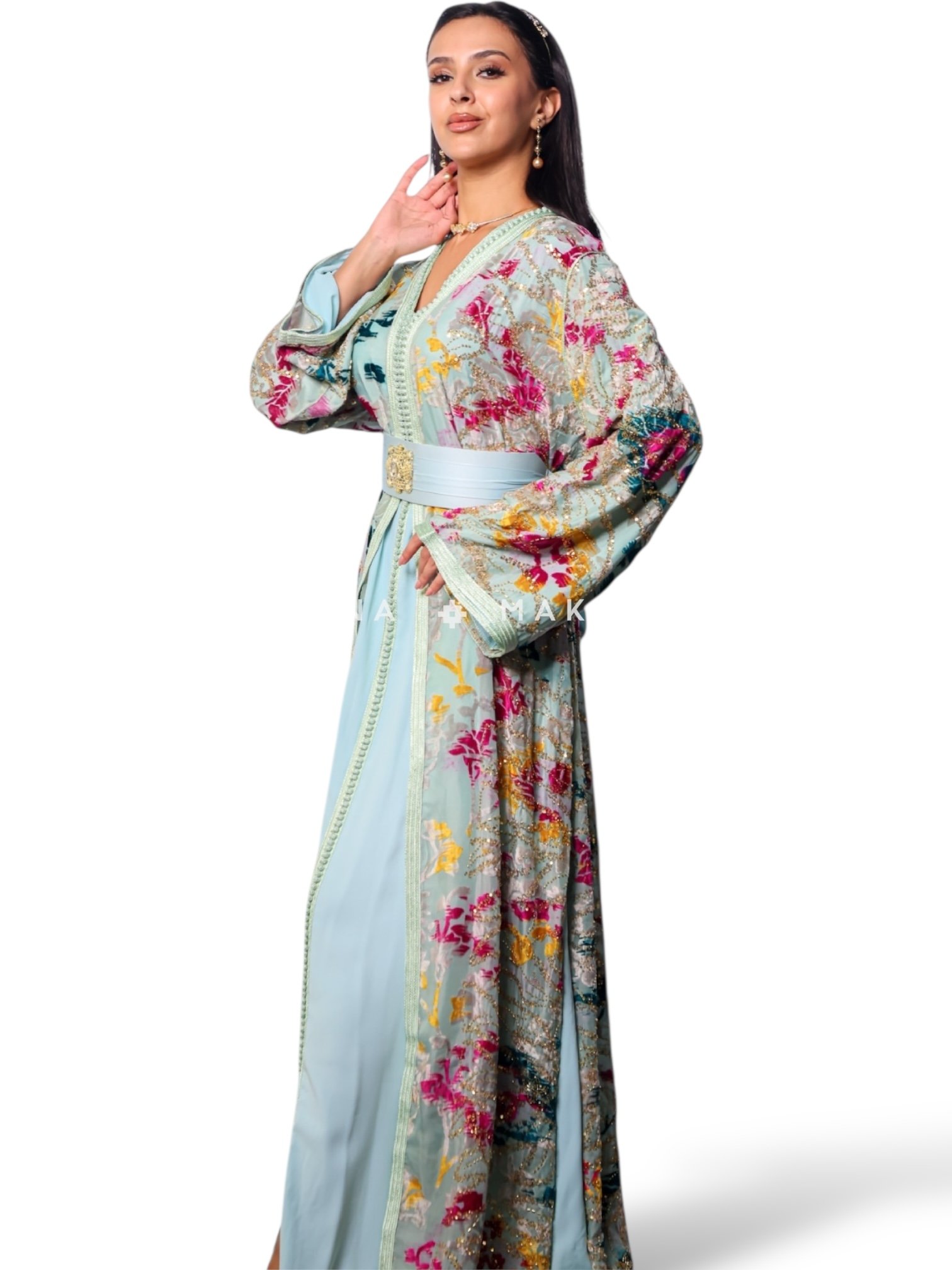 - Elegant two-piece Moroccan caftan made from silk and Rosemir fabrics, featuring exquisite handcrafted beadwork (chak). A perfect blend of luxury and tradition.