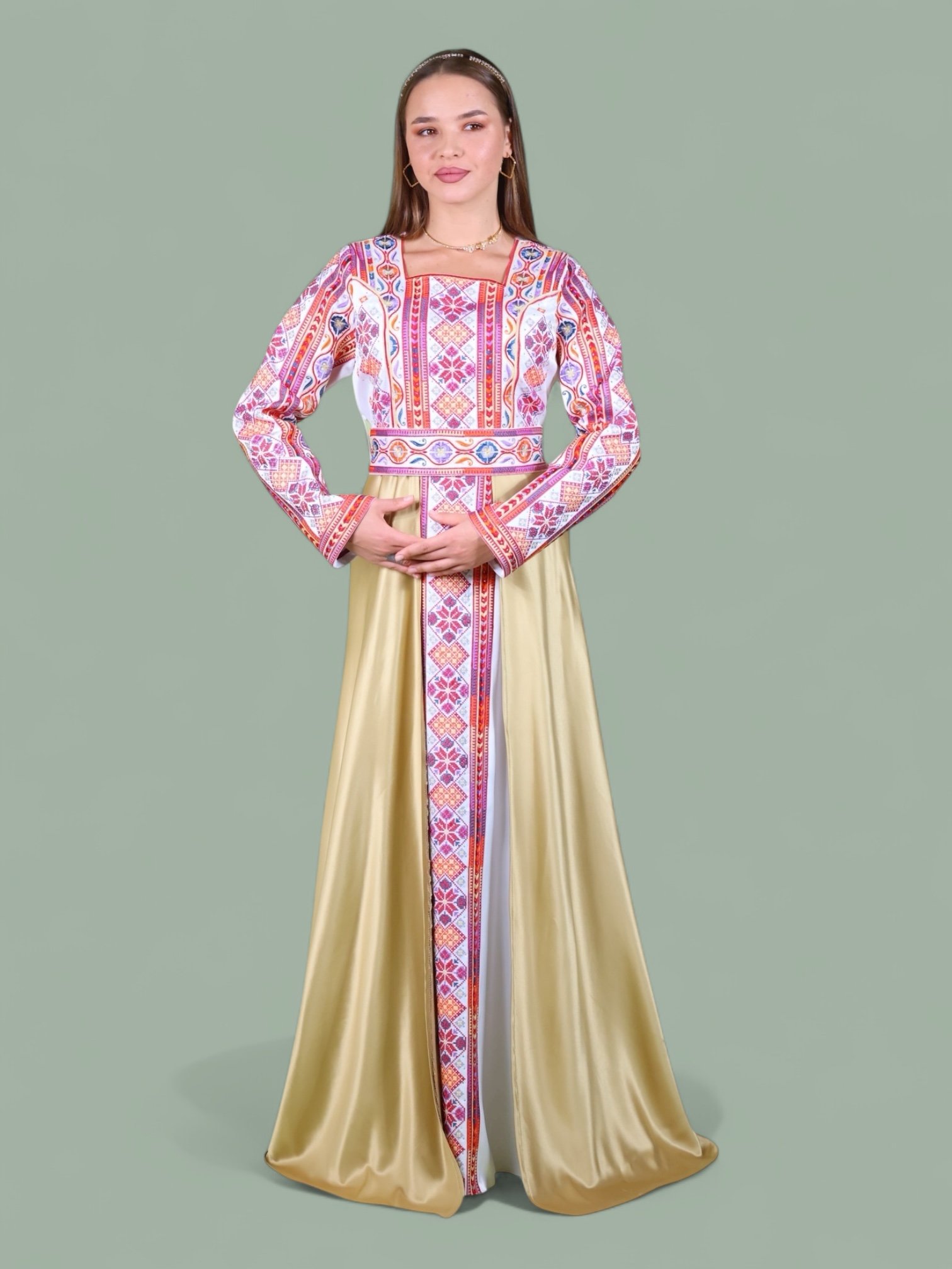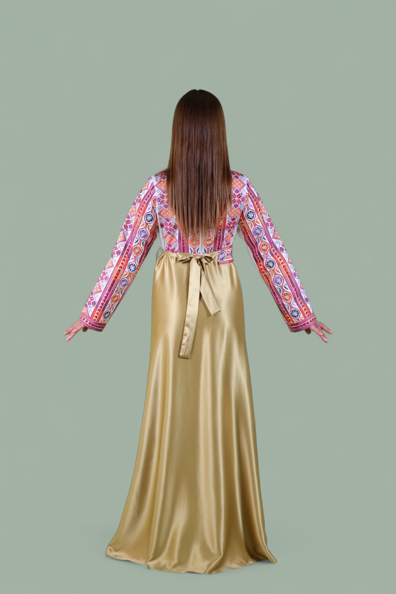 - A stylish modern folk kaftan crafted from first-grade Jessica fabric, featuring delicate hand hoop embroidery. This piece beautifully combines contemporary design with traditional craftsmanship.