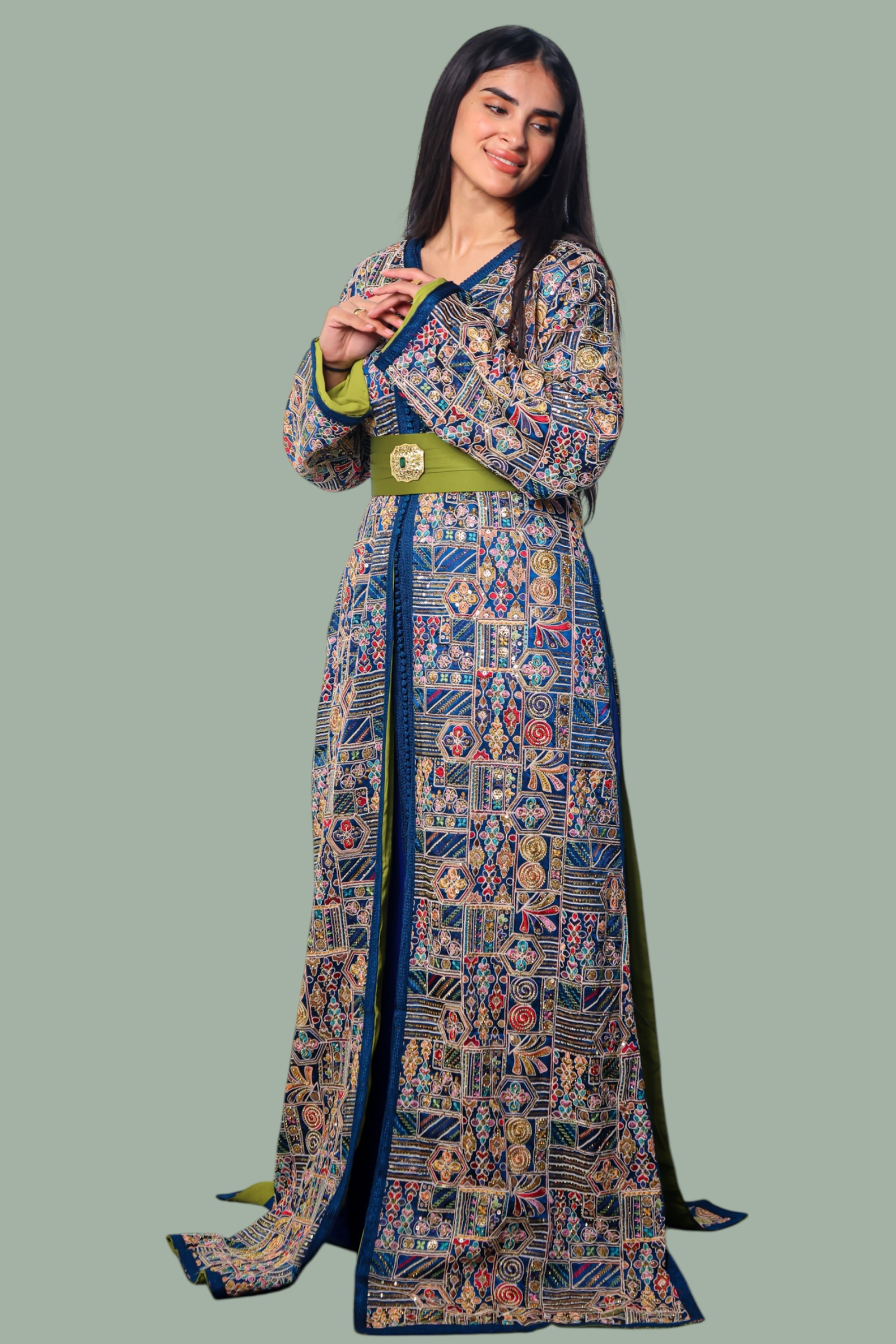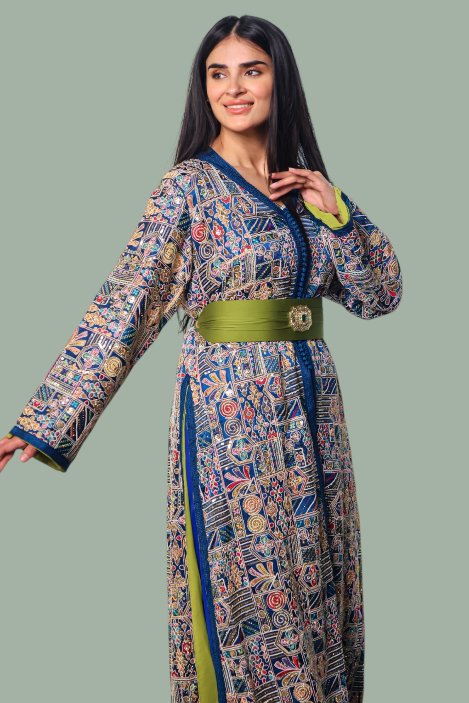 • قفطان مغربي قطعتين بالشك اليدوي على قماش الحرير و الروزمير