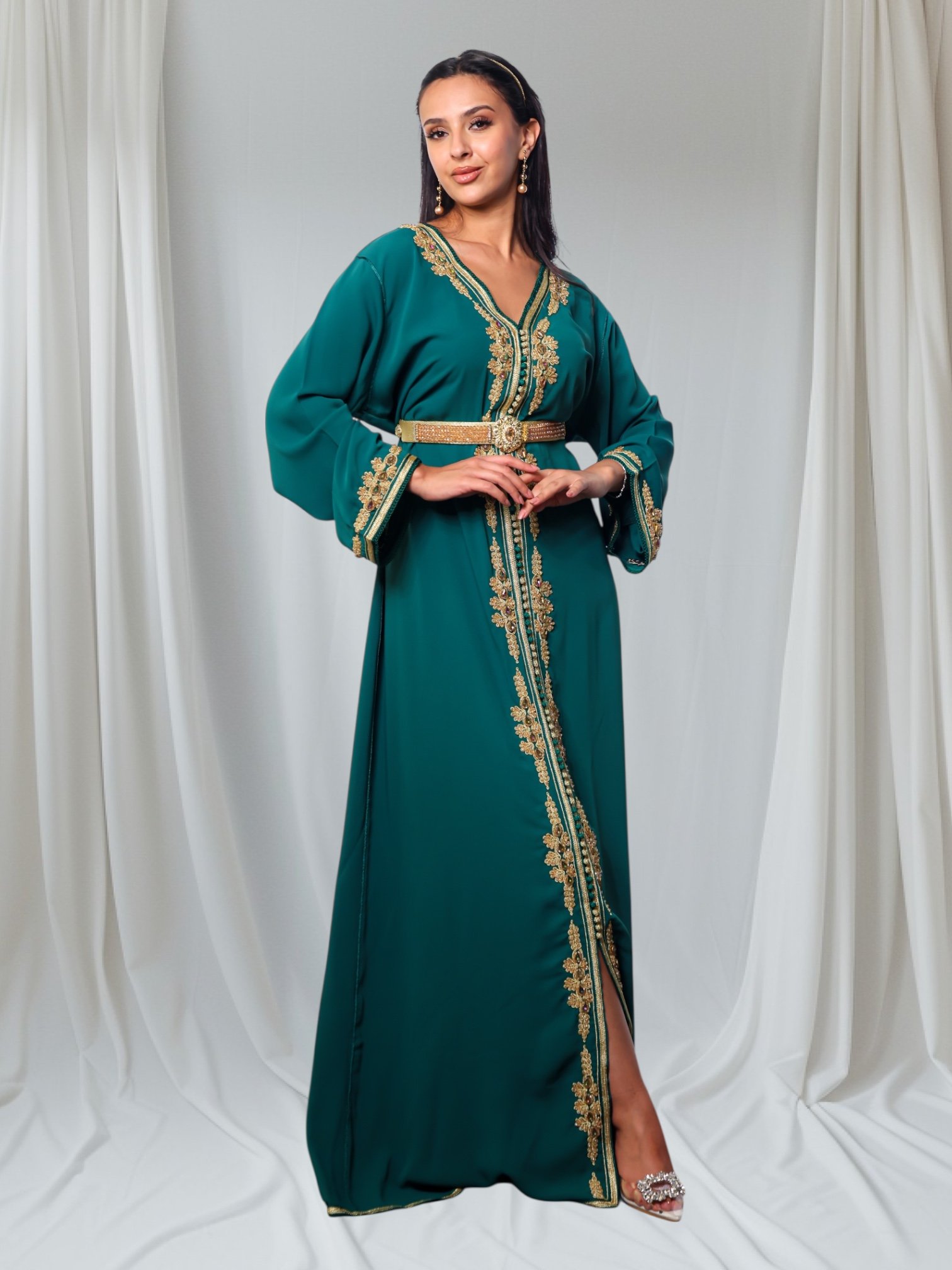 • Handcrafted Moroccan Kaftan with Delicate Golden Beading