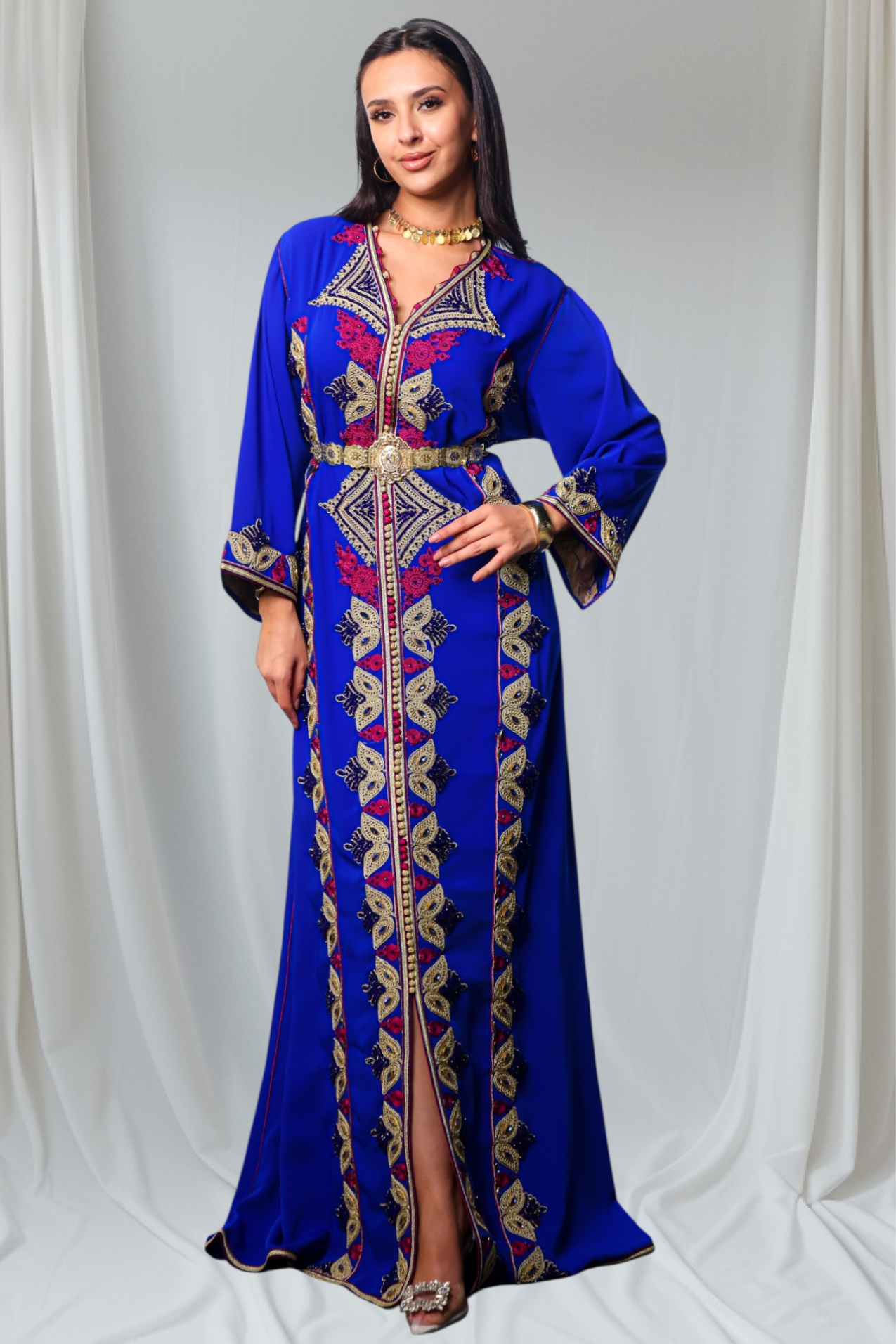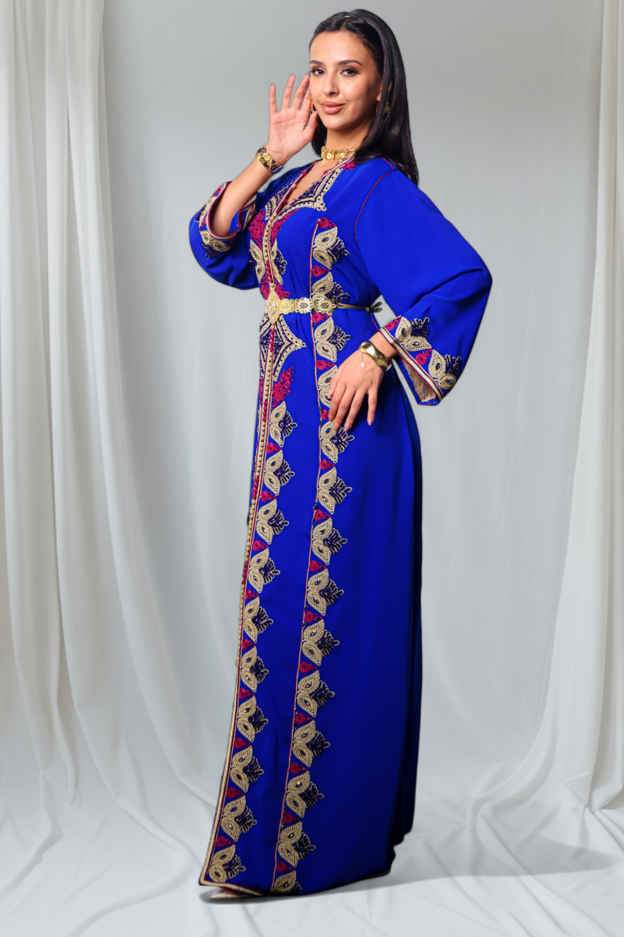 - A refined Moroccan kaftan, meticulously handmade using top-grade crepe fabric — combining luxurious texture with traditional elegance for a truly timeless look.