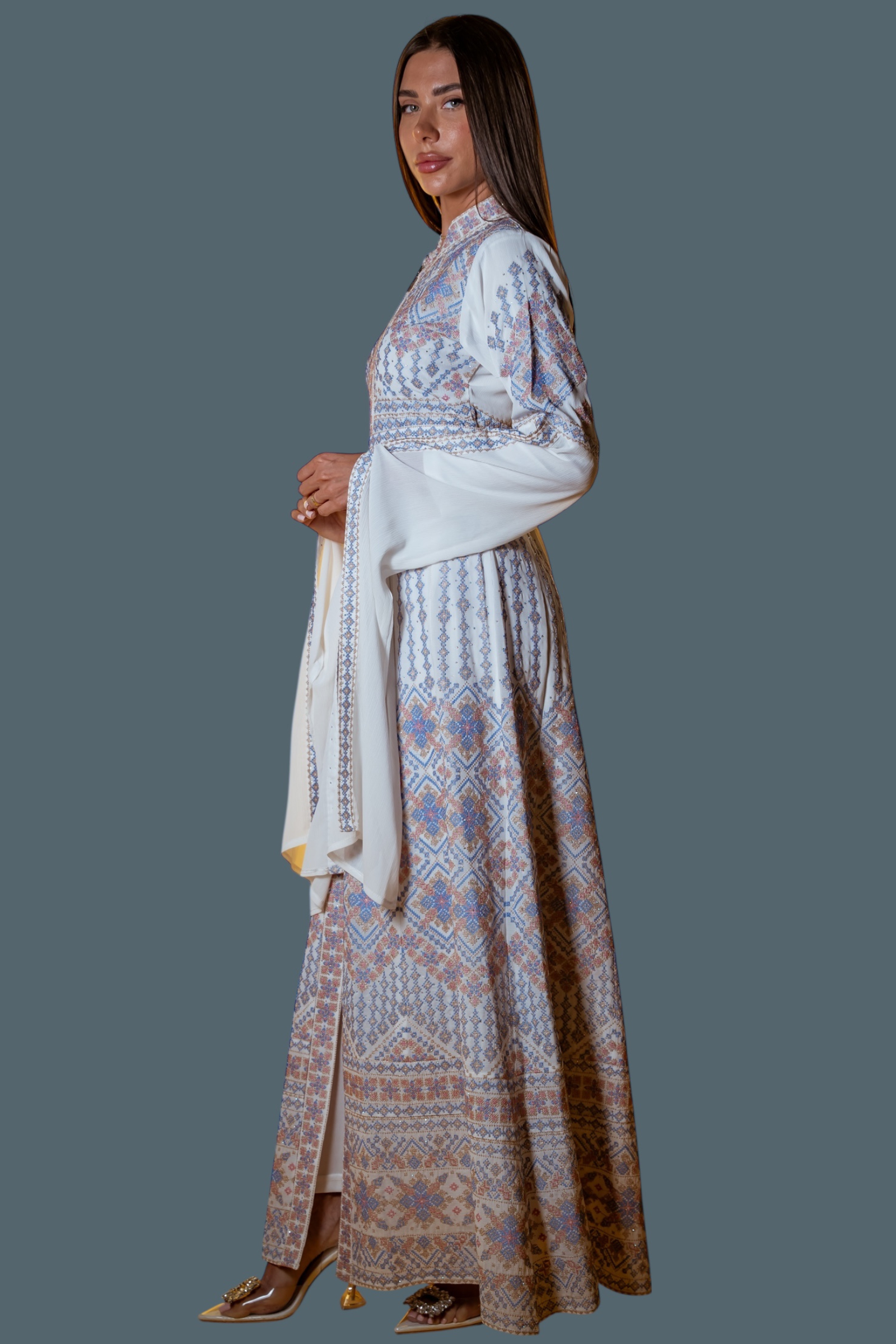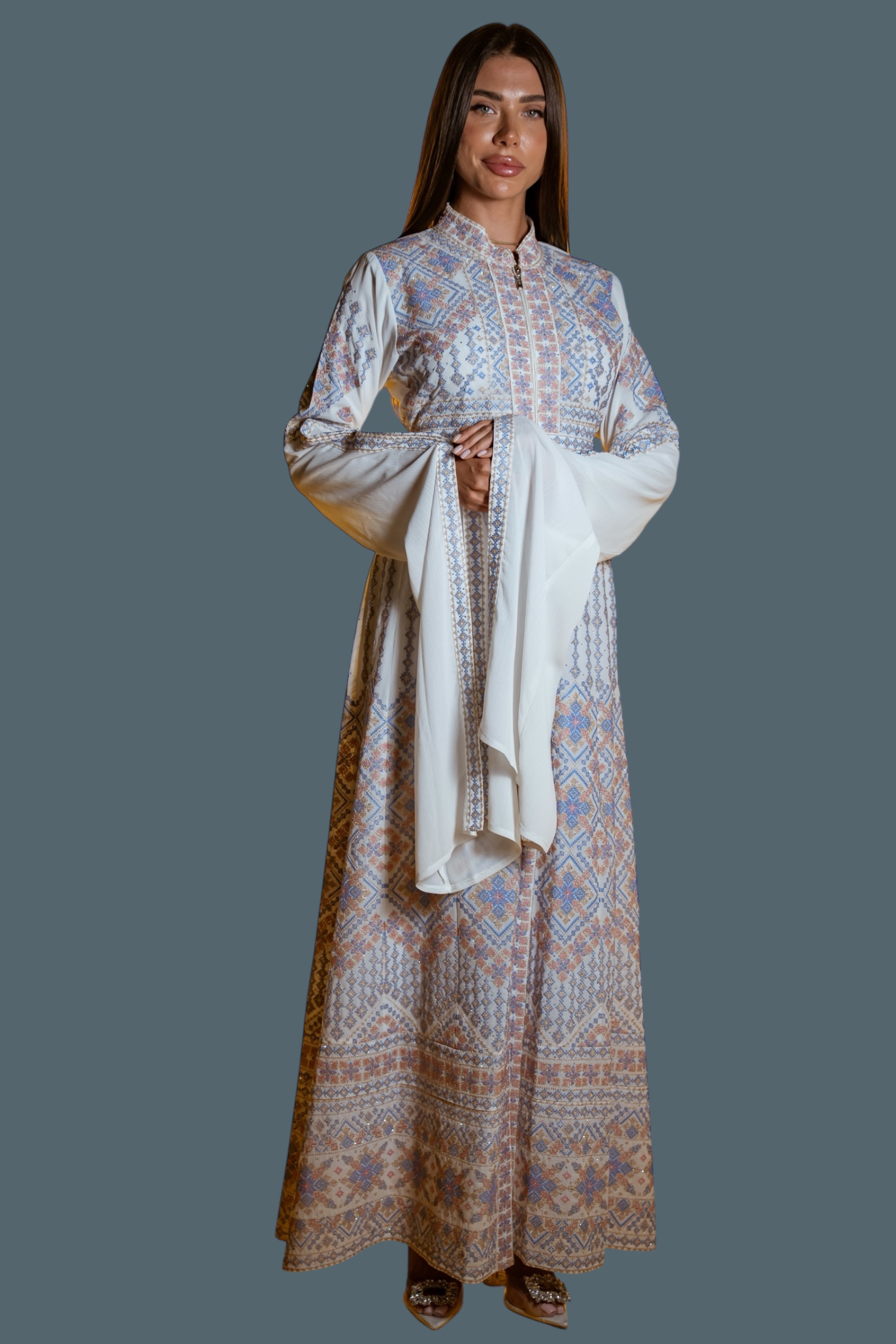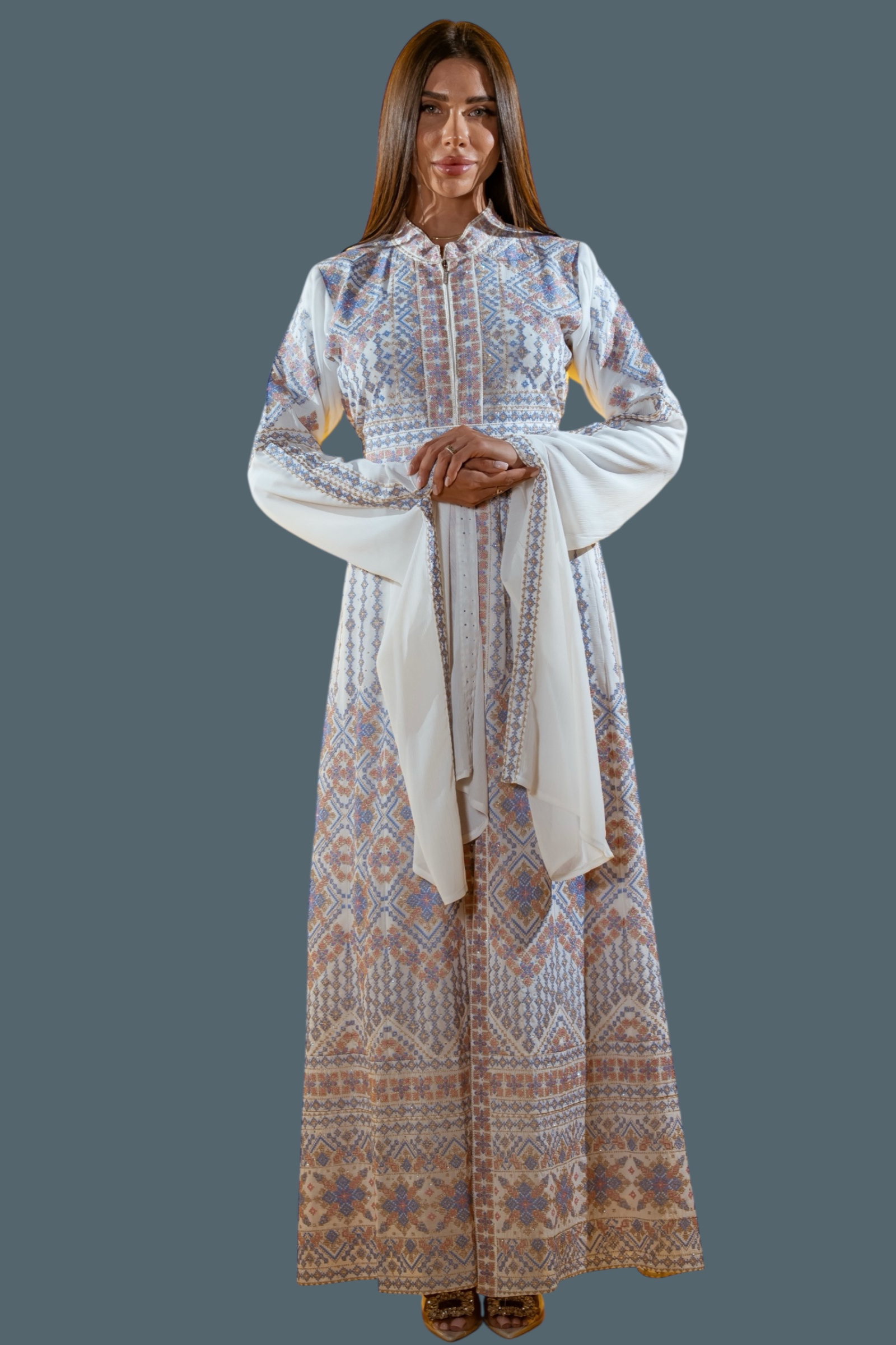 • A stunning folk-inspired kaftan featuring the elegant Sharqi cut, beautifully embroidered with fine Spanish metallic thread. Combining traditional craftsmanship with refined style, it’s perfect for cultural and festive occasions.