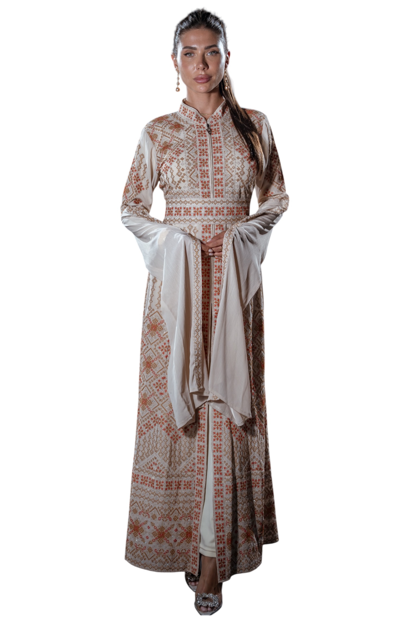 - A stunning folk-inspired kaftan featuring the elegant Sharqi cut, beautifully embroidered with fine Spanish metallic thread. Combining traditional craftsmanship with refined style, it’s perfect for cultural and festive occasions.