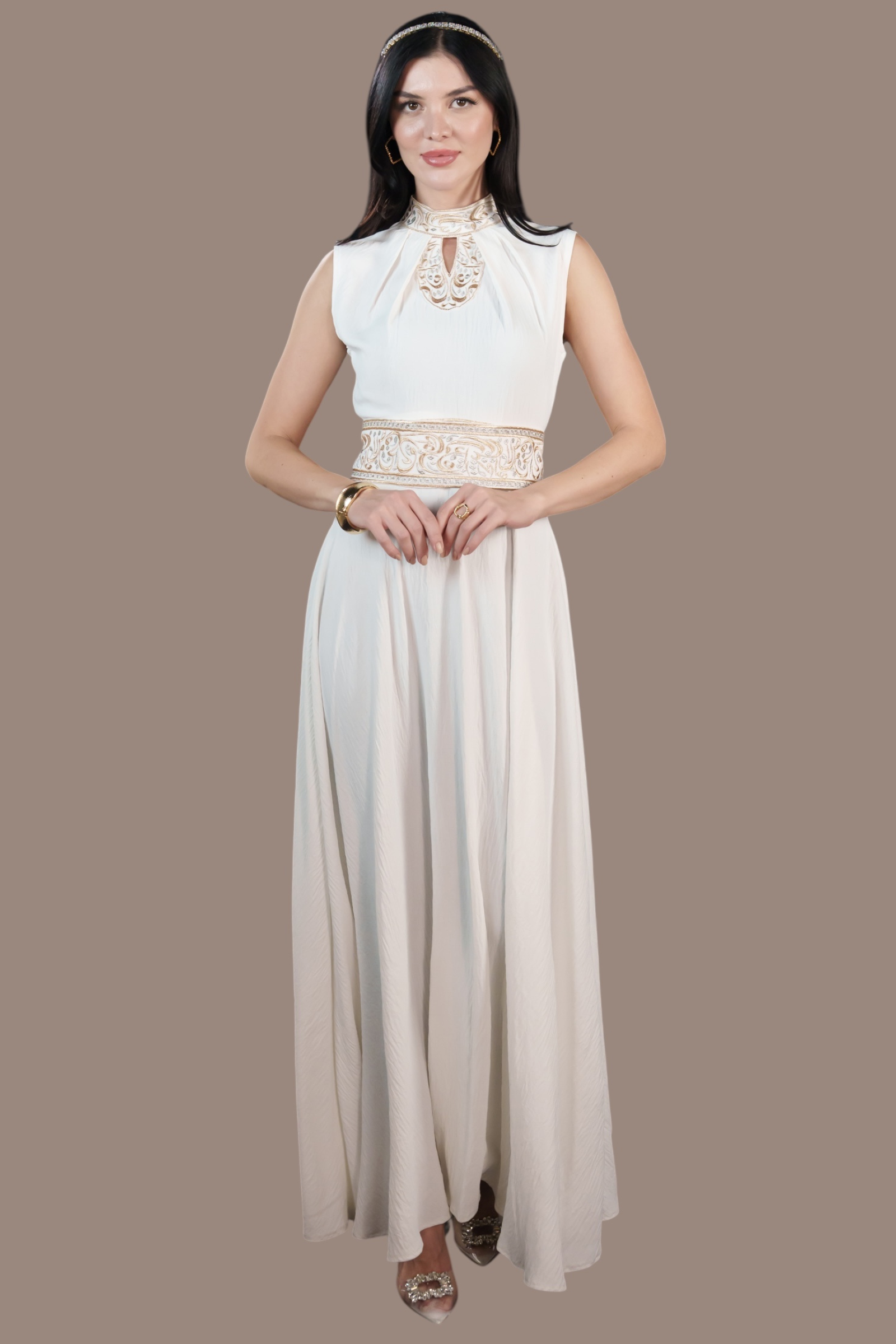- A luxurious two-piece Moroccan kaftan crafted from premium linen fabric, featuring elegant silk embroidery enriched with Spanish metallic thread. This exquisite piece reflects traditional Moroccan craftsmanship with a refined, modern touch — perfect for elegant occasions and celebrations.