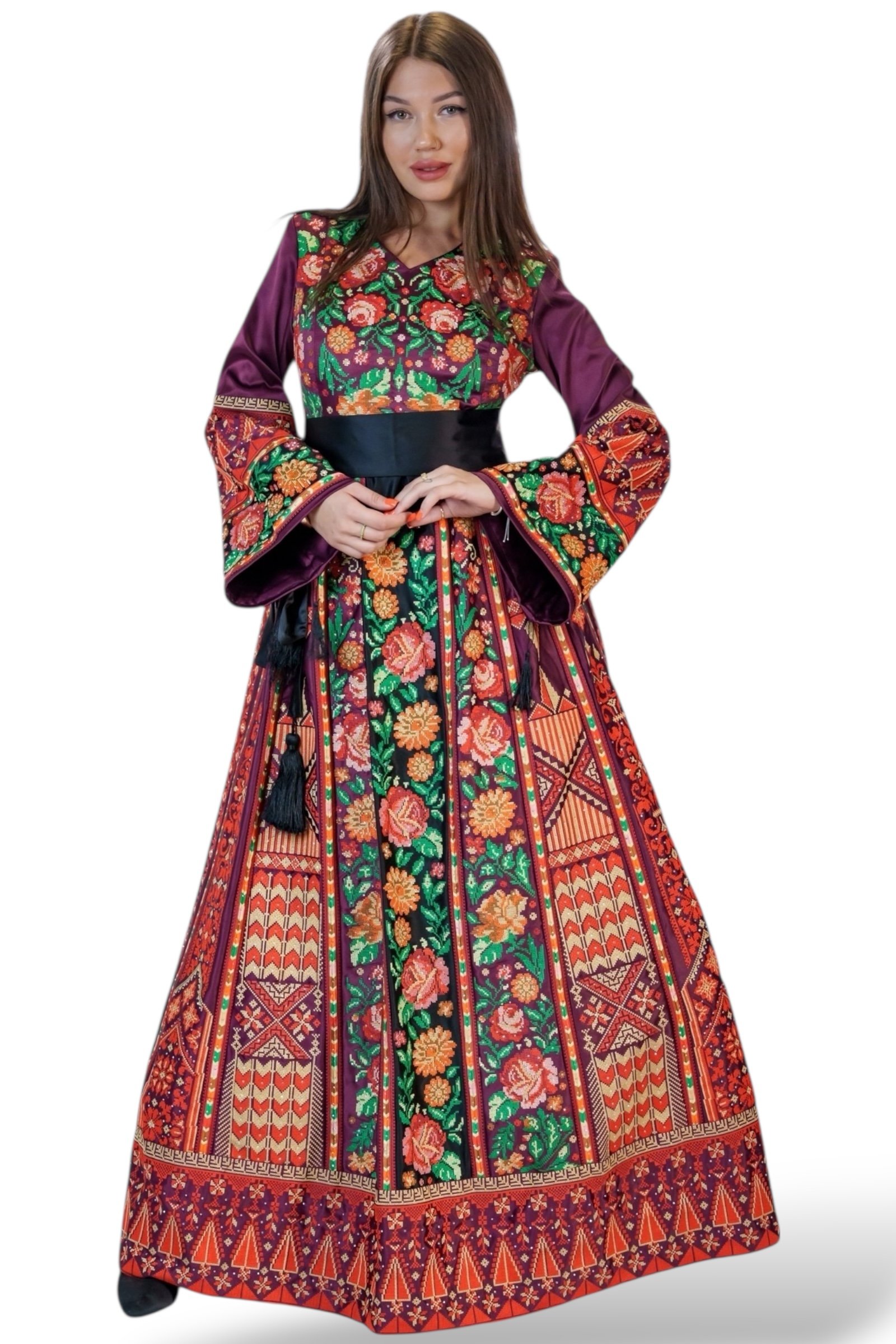 - A modern Falahi thobe crafted from soft Rosmar fabric, adorned with authentic Jordanian embroidery. This piece blends traditional craftsmanship with a contemporary, elegant design.