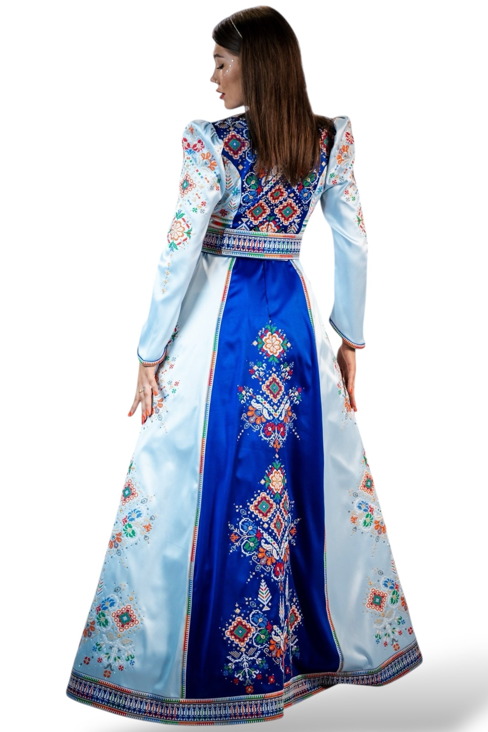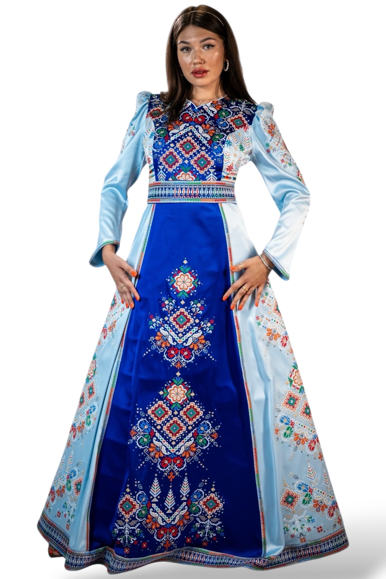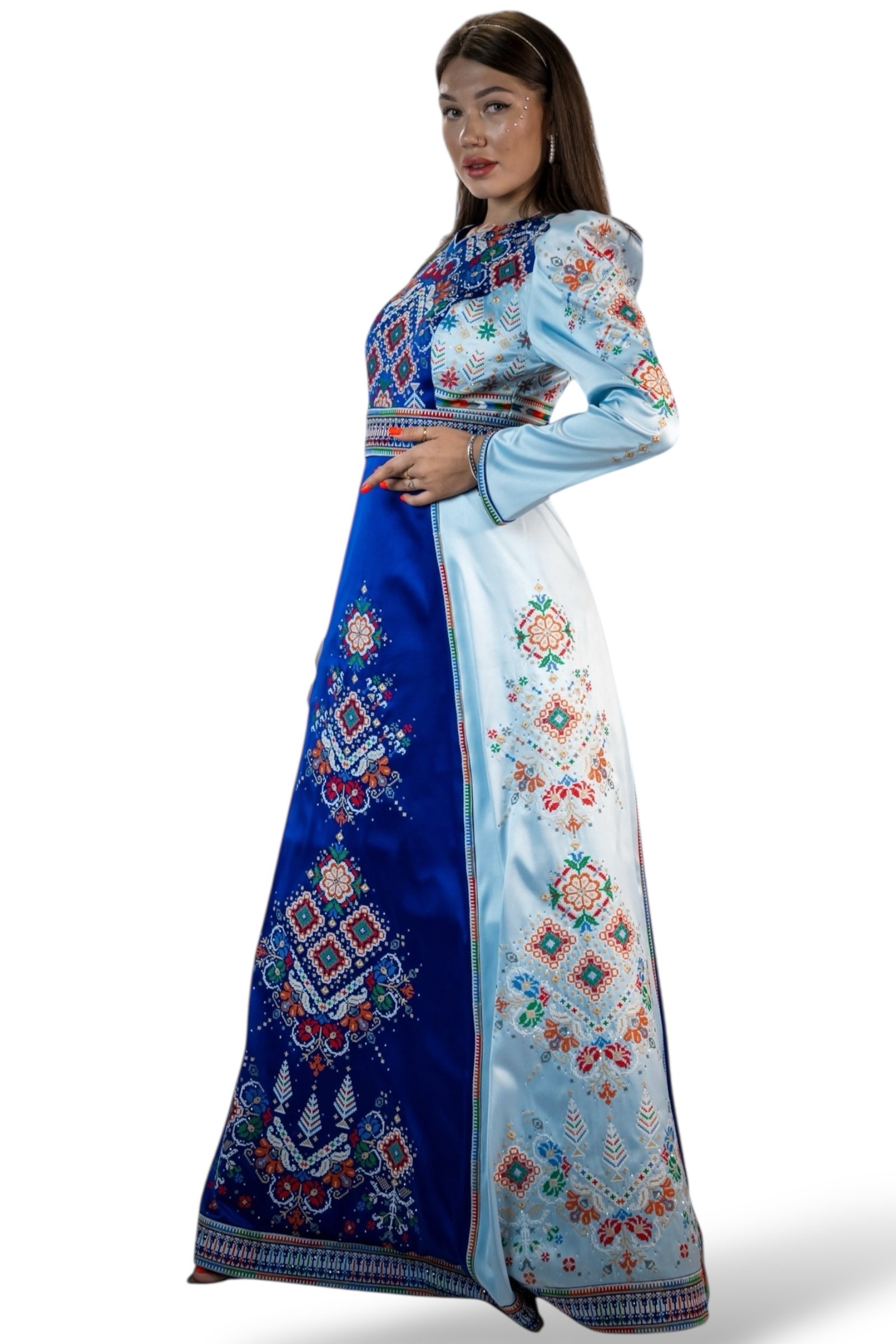 • Modern Falahi thobe with Jordanian embroidery on Rosmar fabric.