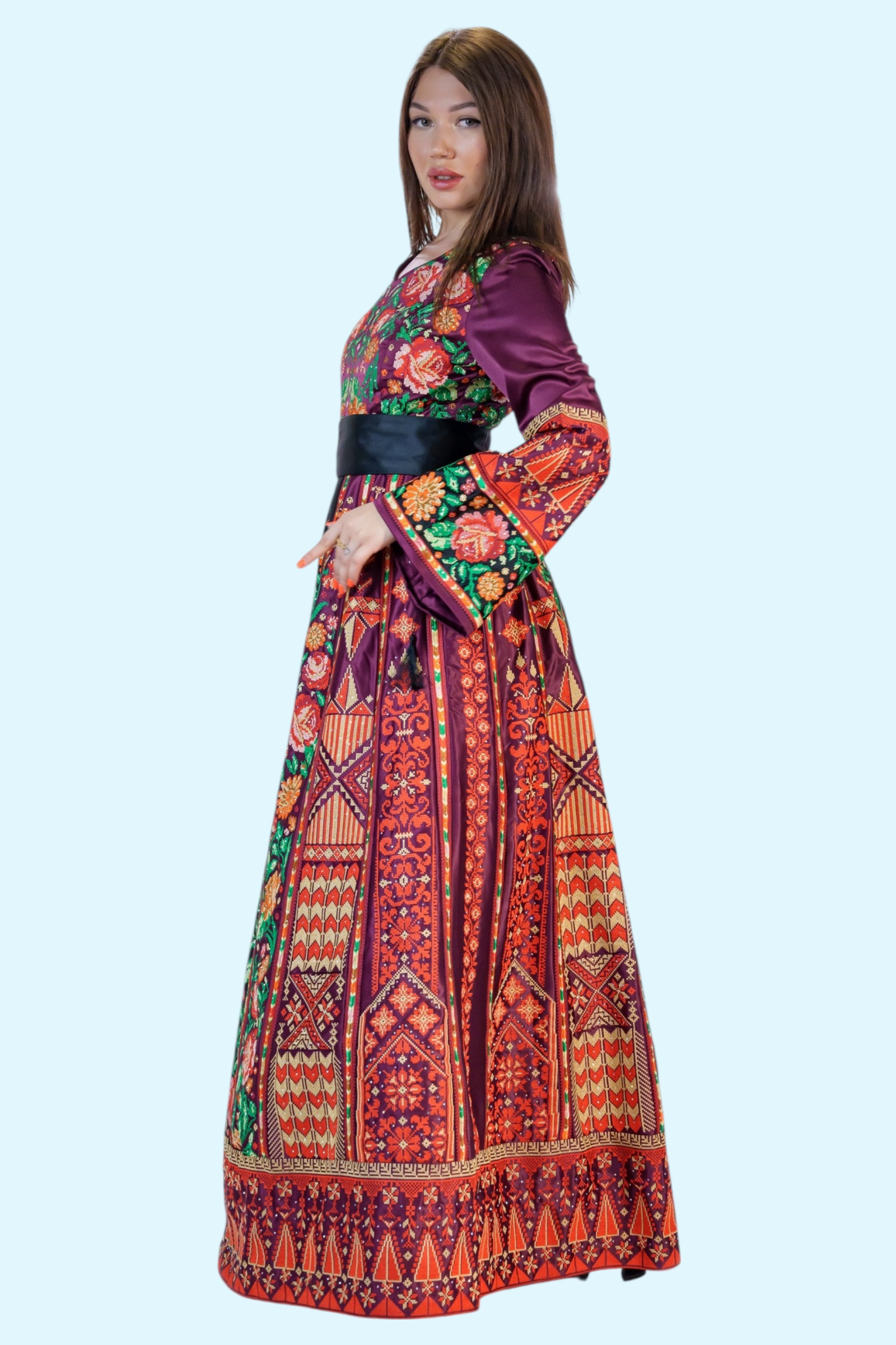 - A modern Falahi thobe crafted from soft Rosmar fabric, adorned with authentic Jordanian embroidery. This piece blends traditional craftsmanship with a contemporary, elegant design.
