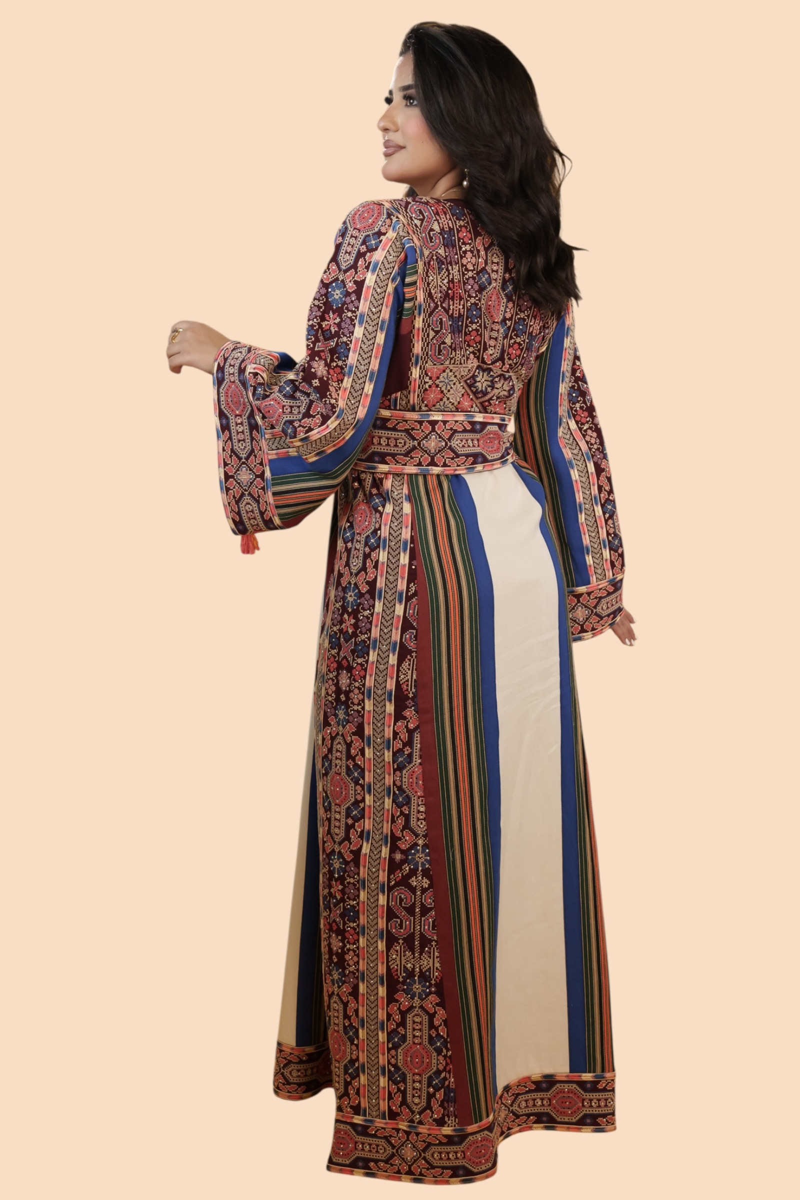 • Majdalawi half-Tallas thobe with eight-stitch embroidery between two needles in silk thread on linen fabric.
