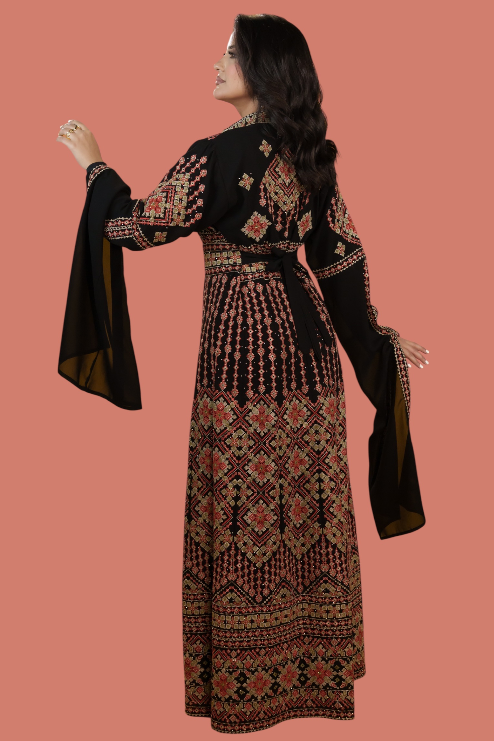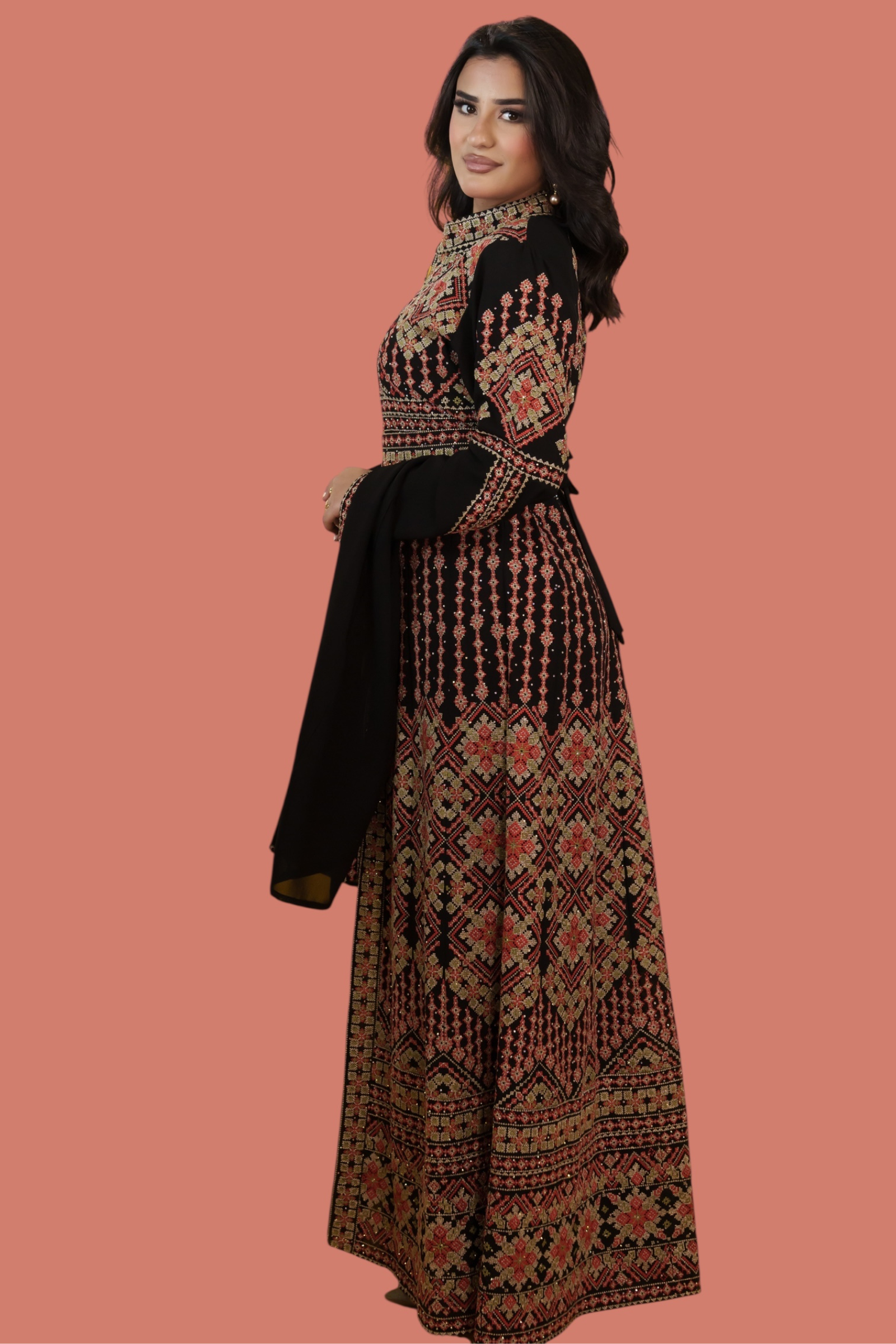 - A stunning folk-inspired kaftan featuring the elegant Sharqi cut, beautifully embroidered with fine Spanish metallic thread. Combining traditional craftsmanship with refined style, it’s perfect for cultural and festive occasions.
