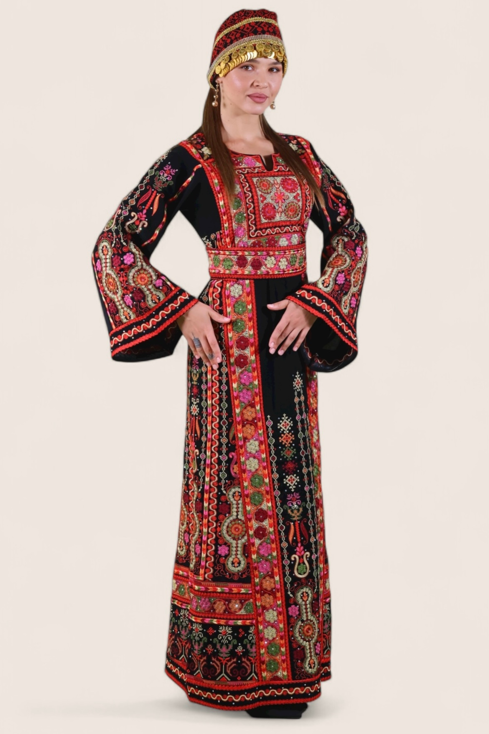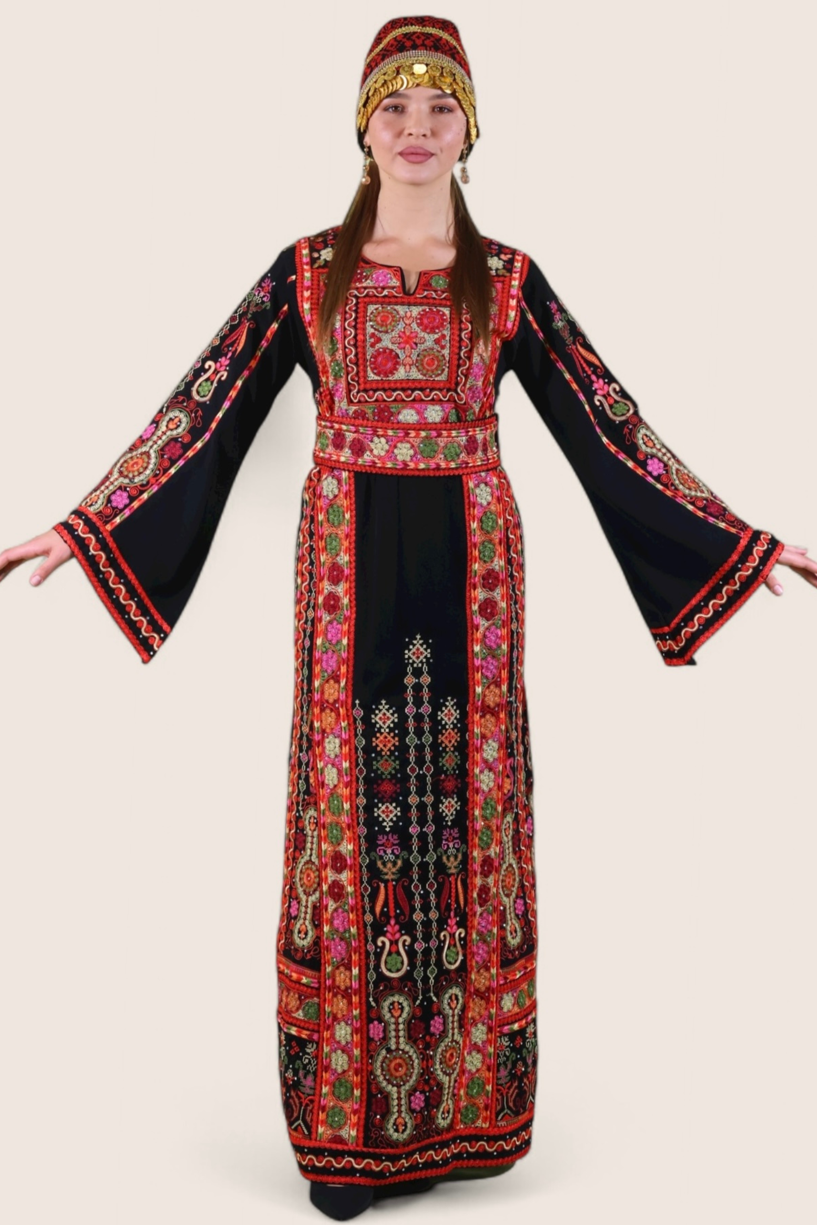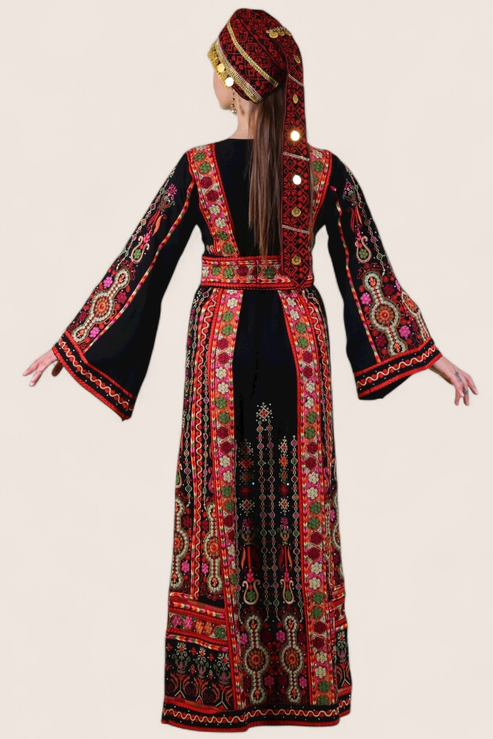 - A stunning half-Tallas queen thobe, intricately embroidered with shimmering Spanish qasab thread. The design features the traditional eight-stitch pattern, skillfully crafted between two needles—a true blend of royal elegance and heritage detail.