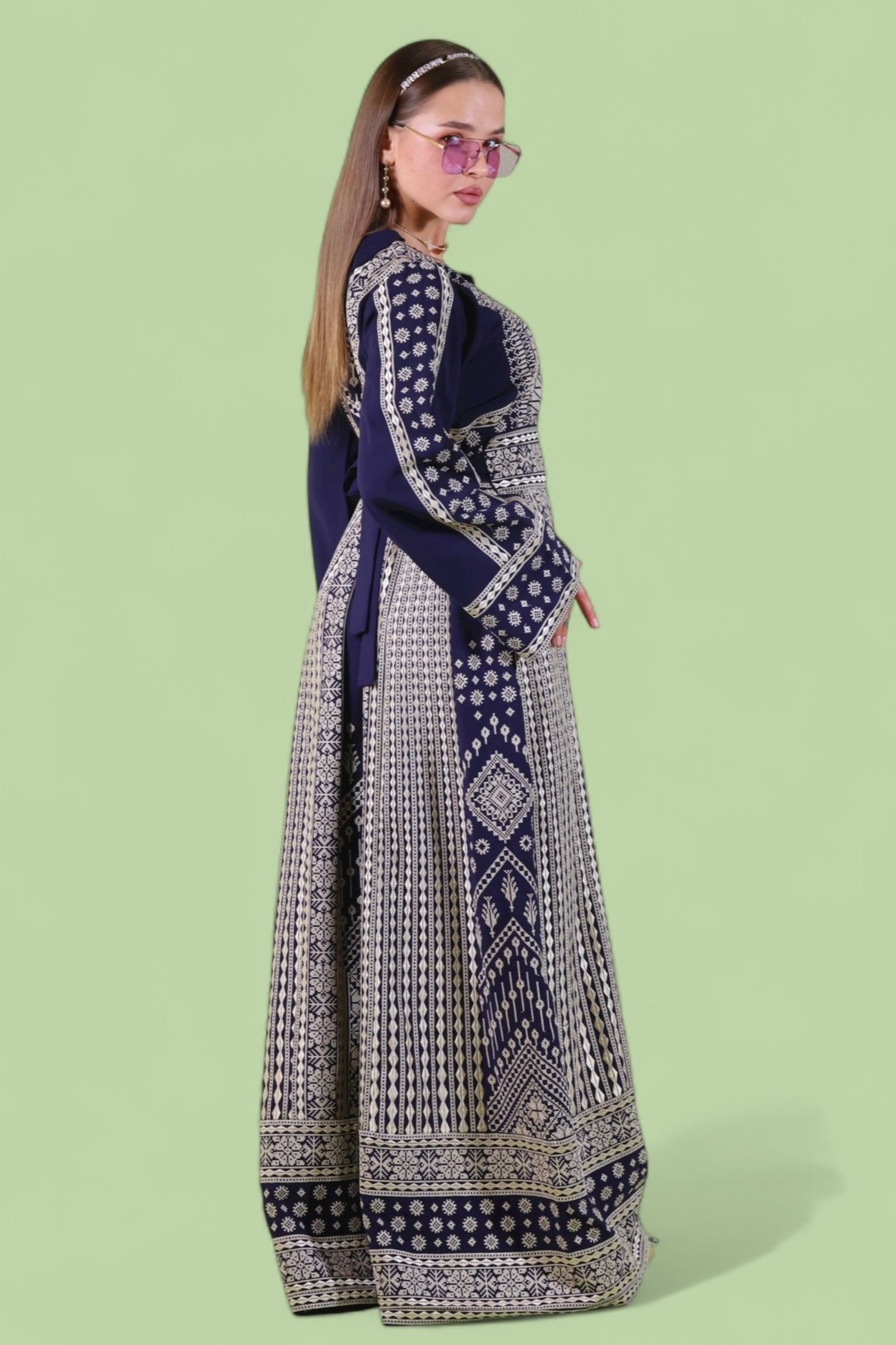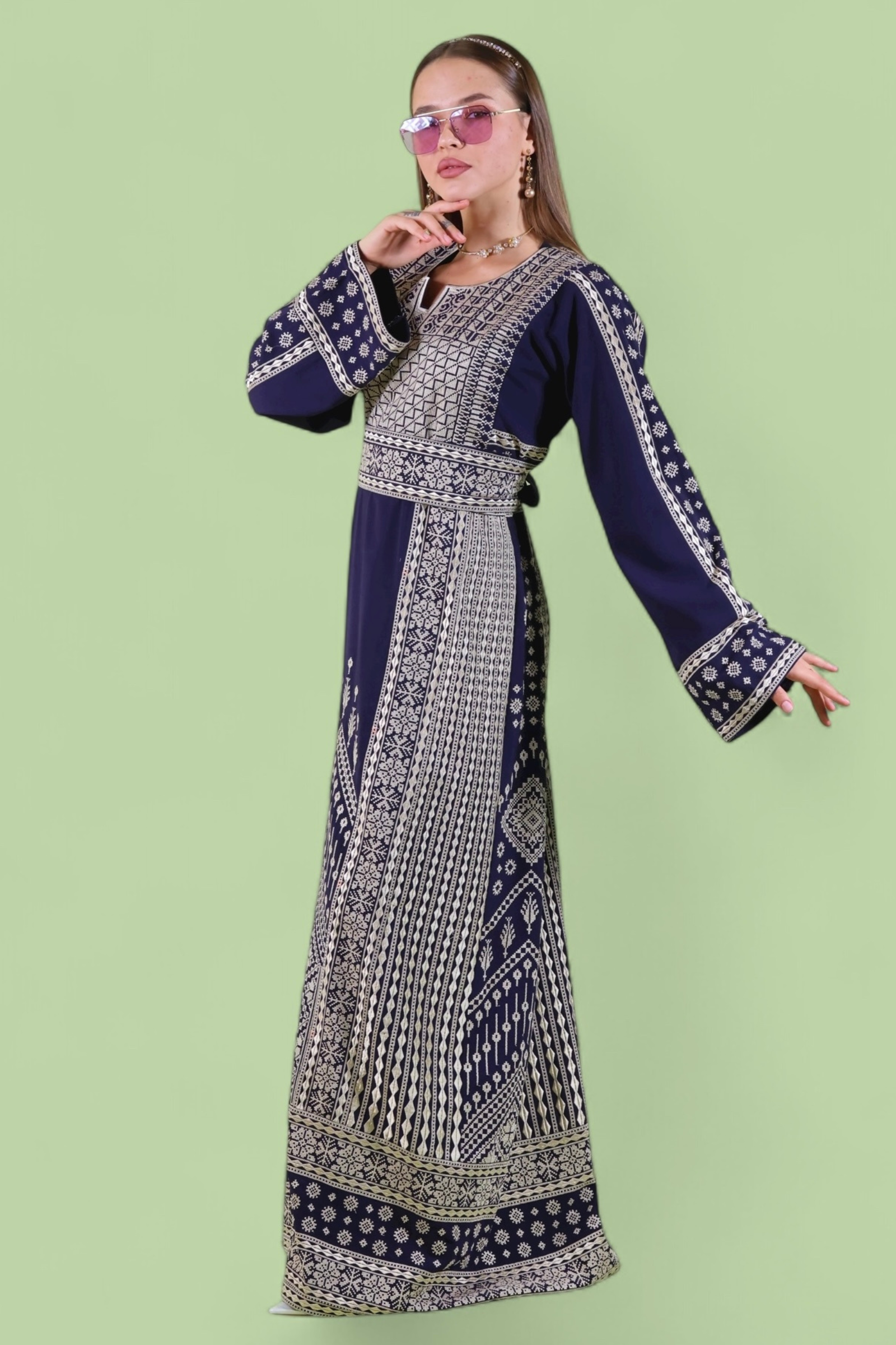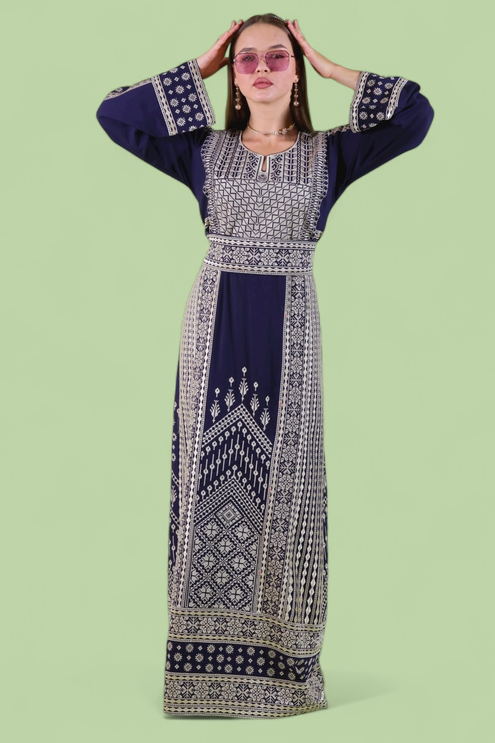 • This elegant thobe showcases the timeless beauty of heritage craftsmanship, featuring delicate hand embroidery using Spanish qasab (metallic) thread. The design highlights traditional Palestinian “fallahi” (rural) embroidery with the iconic eight-stitch pattern, blending cultural pride with refined elegance. Perfect for those who appreciate authentic details and artisanal touches in traditional women’s wear.