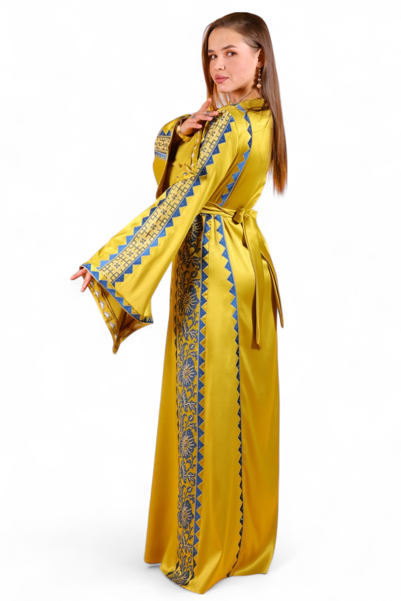 ثوب مودرن من قماش الجيسكا بتطريز ناعم بخيط الحرير على مكينة الطارة