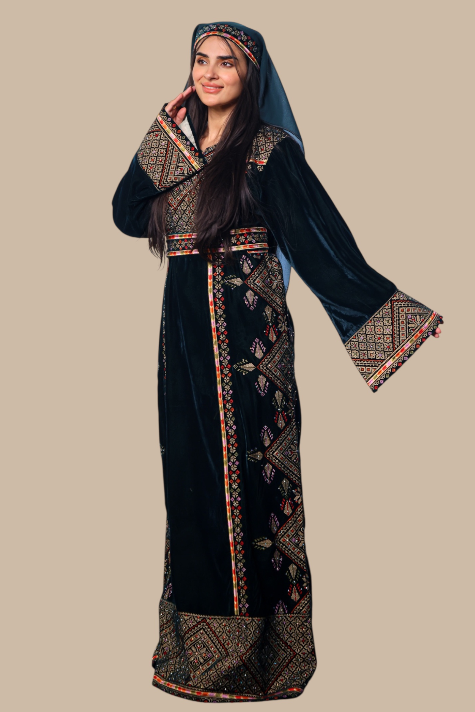 ثوب مطرز على قماش مخمل كريستال الناعم بالتطريز الفلاحي المميز