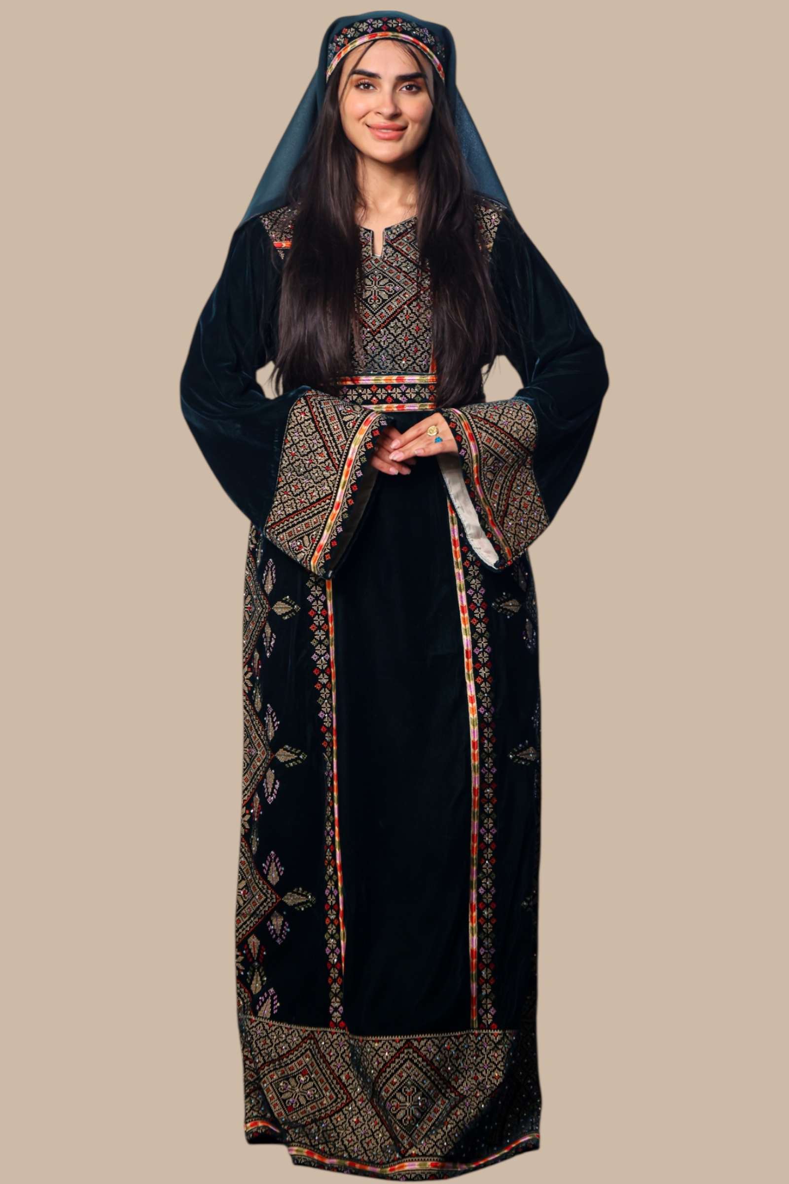 - A refined thobe crafted from soft crystal velvet, featuring standout traditional Fellahi embroidery. Rich in texture and cultural charm.