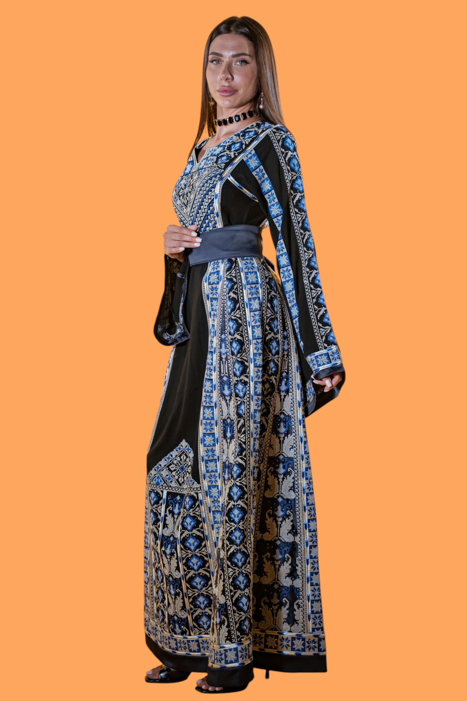 • A delicate half-tulle dress beautifully embroidered with silk thread and Spanish cane, crafted on smooth, soft ink fabric. Perfect for elegant occasions, combining fine materials with intricate detailing.