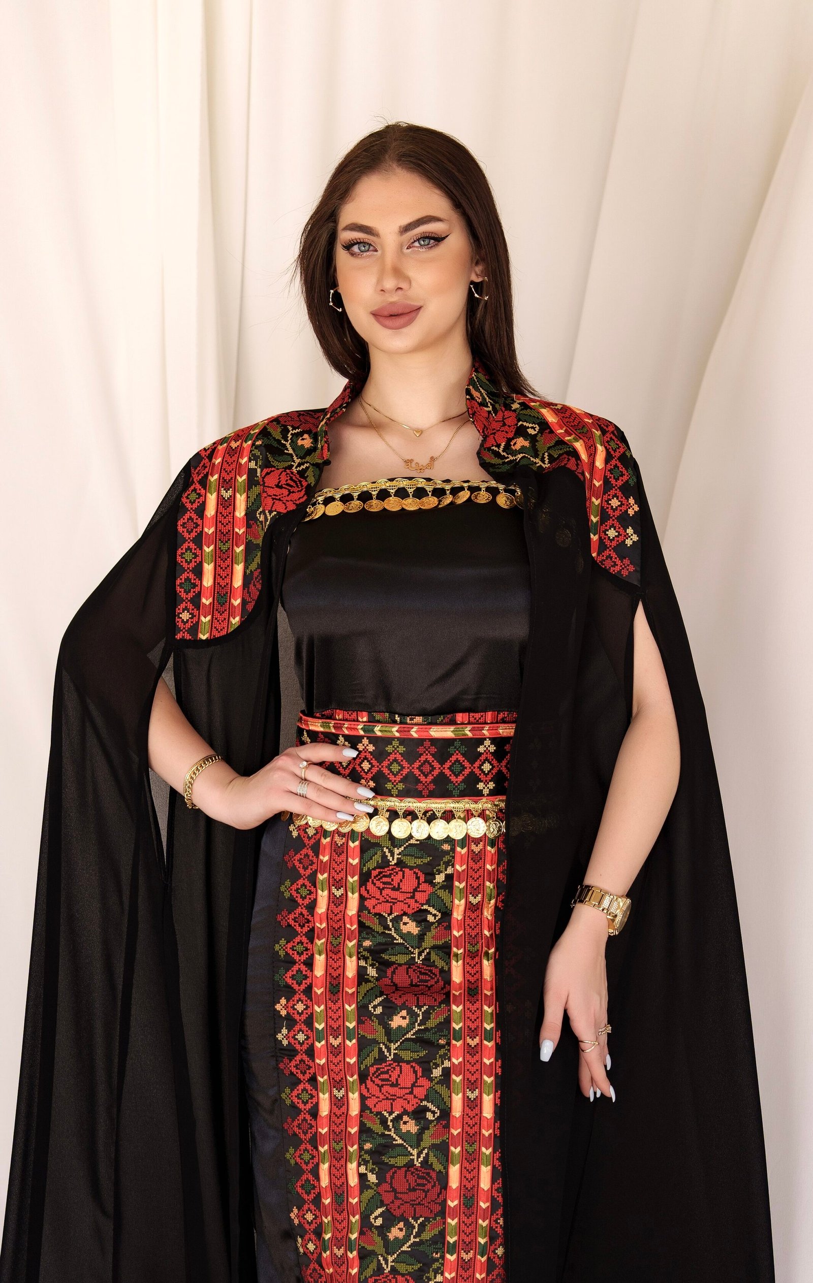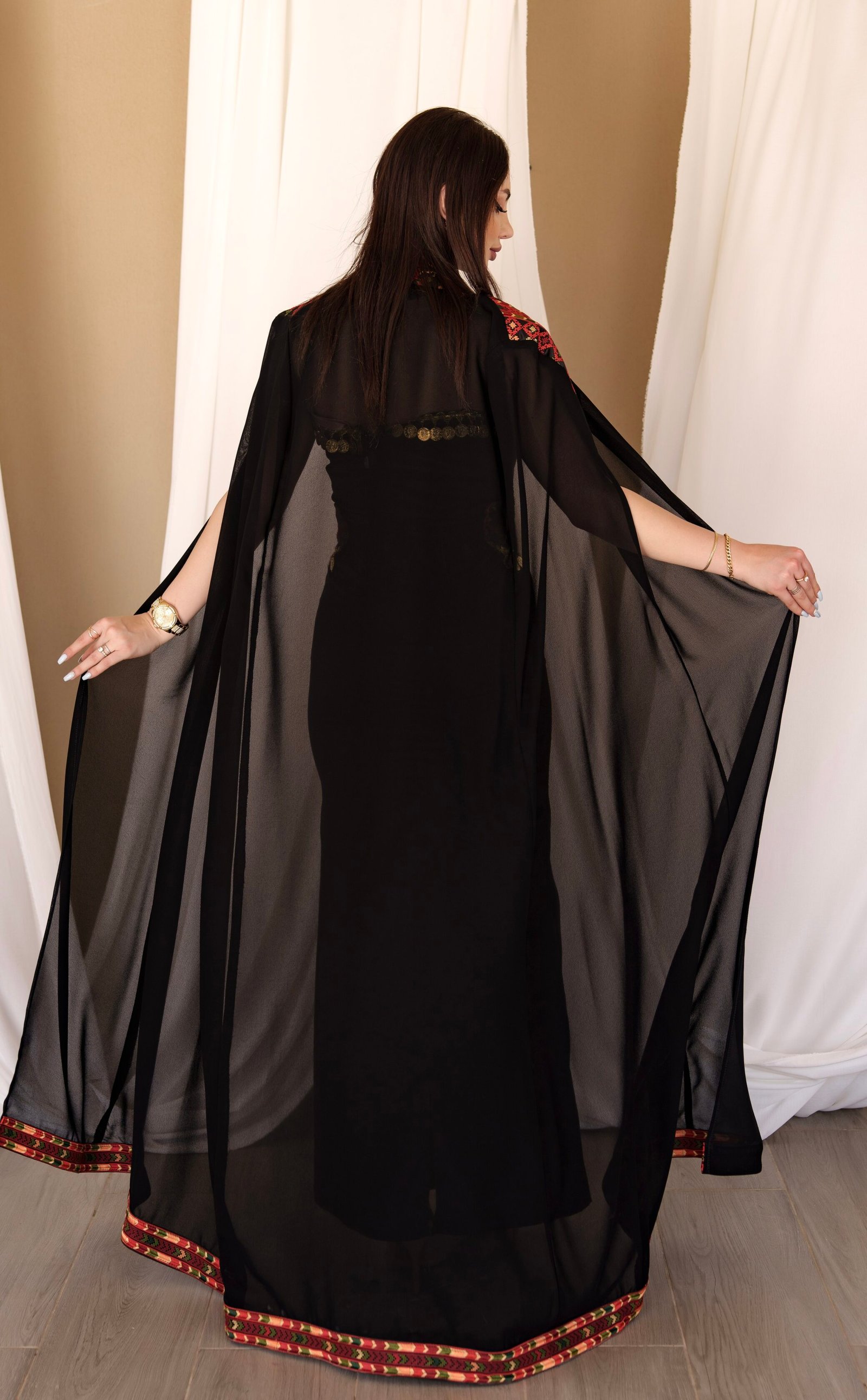 - A unique backless Fellahi dress made from Jeska fabric, beautifully embroidered using a hand-operated Tara machine and styled with a matching cape. A modern take on traditional elegance.